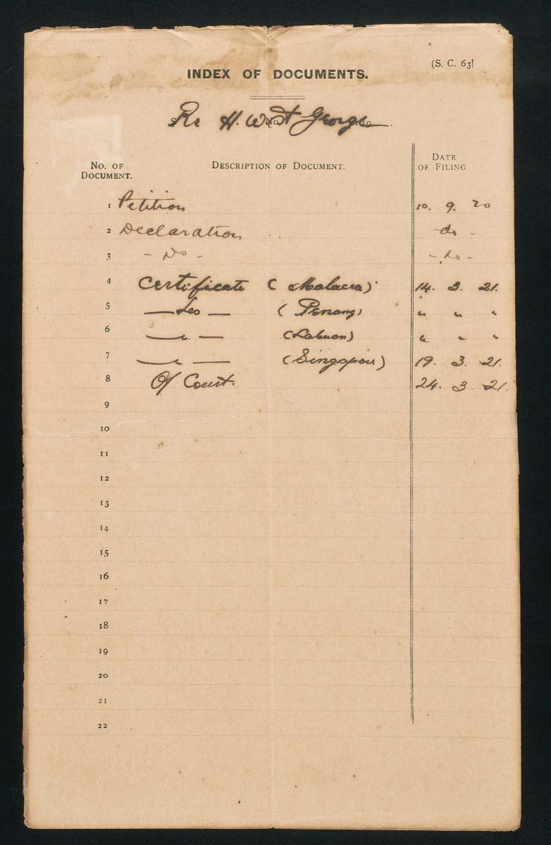 This is a note dated 30 June 1921 written by Sission and Delay, acknowledging receipt of papers marked H.W. St G 1 to 3 from the Registry of the Supreme Court of the Straits Settlements in Singapore. It is part of a collection of legal documents from the 19th and early 20th centuries which provides a glimpse into the work of the notable personalities who left their mark on Singapore’s legal history, and the economic and other transactions undertaken by ordinary immigrants in 19th century Singapore that tell stories of misfortune and indebtedness which would otherwise have disappeared from history.
