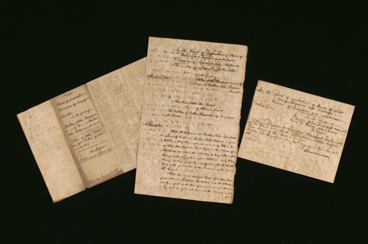 These are the warrant to act and the petition issued by John Newman, the plaintiff in the suit against the defendant Henry Oceanus Cooke. The warrant to act was issued on 24 October 1857. Both documents are part of a collection of legal documents from the 19th and early 20th centuries which provides a glimpse into the work of the notable personalities who left their mark on Singapore’s legal history, and the economic and other transactions undertaken by ordinary immigrants in 19th century Singapore that tell stories of misfortune and indebtedness which would otherwise have disappeared from history.