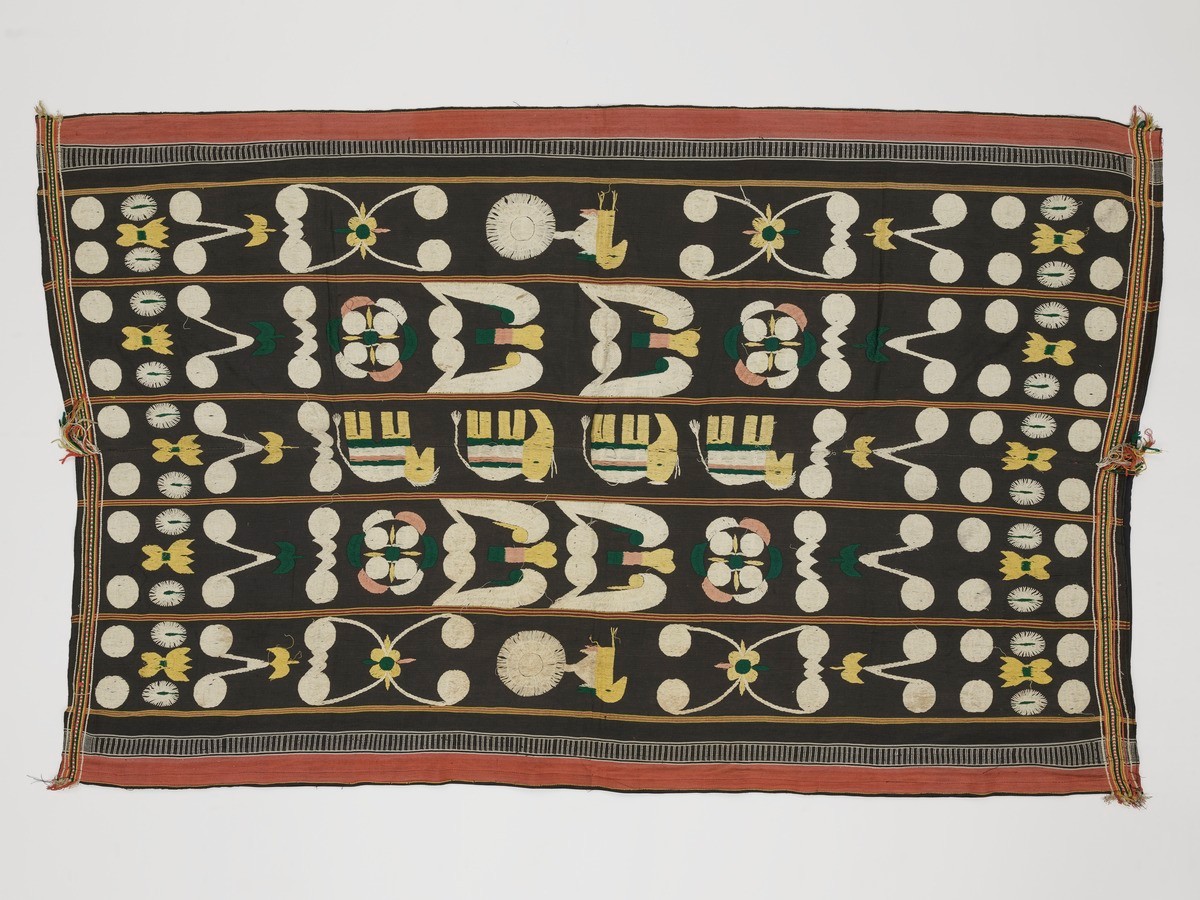This shawl, as with textiles with Arabic characters, was believed to have talismanic powers: headcloths were believed to have protective powers and were worn by men in battle; shoulder cloths were probably used as shrouds in funerals or hangings at royal circumcisions.