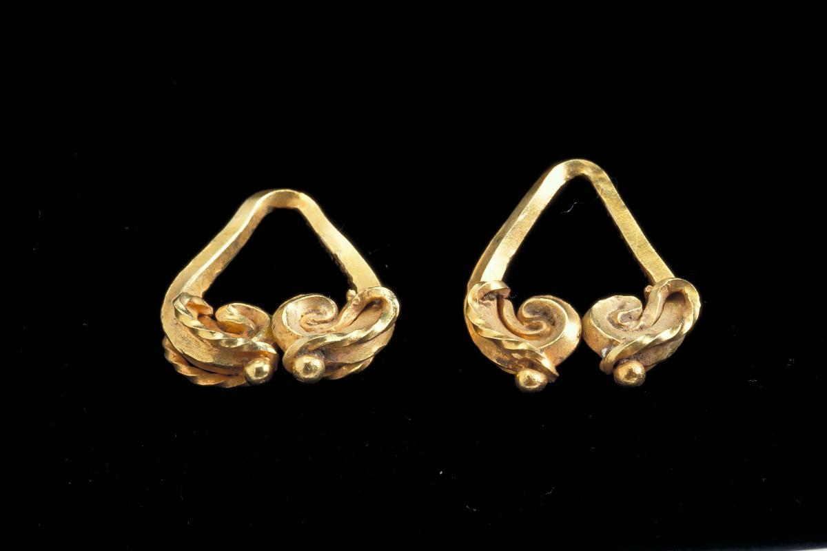 This gold ear ornament is made by rolling gold strips into an arch which terminates in inward spirals. Such double spiral motif was already used in jewellery dating back to before the Common Era in island Southeast Asia. The double spiral motif continues to appear widely across the archipelago, particularly in tribal societies such as the Batak and Nias.