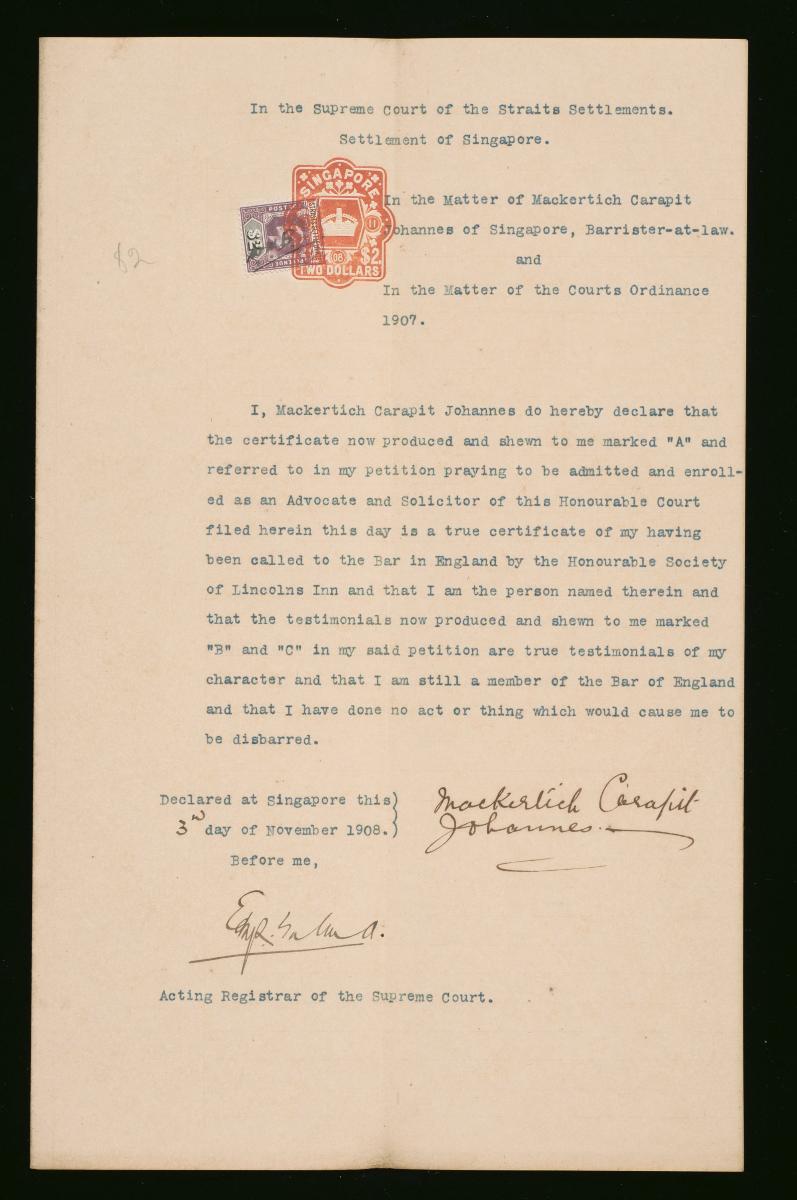 This is an oath sworn by Mackertich Carapit Johannes on 14 July 1909. It is part of a collection of legal documents from the 19th and early 20th centuries which provides a glimpse into the work of the notable personalities who left their mark on Singapore’s legal history, and the economic and other transactions undertaken by ordinary immigrants in 19th century Singapore that tell stories of misfortune and indebtedness which would otherwise have disappeared from history.
