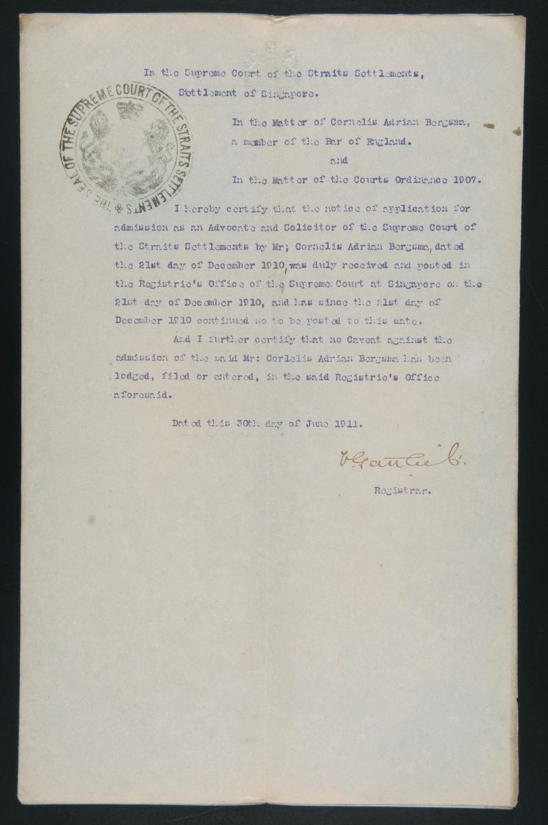 This is the petition of Cornelis Adrian Bergsma for admission as a solicitor and advocate to the Supreme Court of the Straits Settlements. It is part of a collection of legal documents from the 19th and early 20th centuries which provides a glimpse into the work of the notable personalities who left their mark on Singapore’s legal history, and the economic and other transactions undertaken by ordinary immigrants in 19th century Singapore that tell stories of misfortune and indebtedness which would otherwise have disappeared from history.