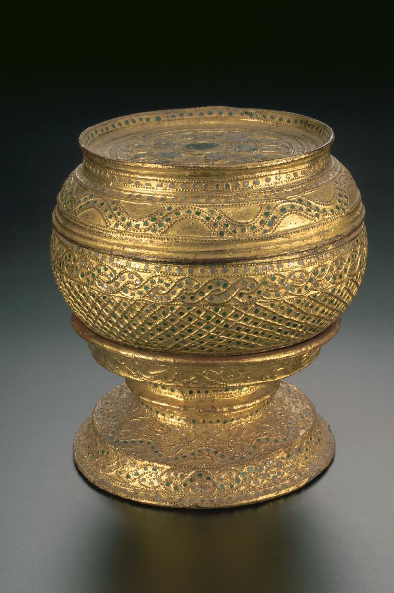 This large, silver bowl is decorated with scenes from the Ramayana, with Rama, Lakshmana and Sita in the broad central band in-between bands of floral motifs as well as court figures in costume such as dancers and musicians. The plain silver rim is ornamented with a band of foliage design. The scenes on the bowl are hammered into the silver in high-relief or repoussé. Towards the base is also a broad band of upturned lotus petals. The shape of the bowl is inspired by a monk's alms bowl and is generally reserved for ceremonial purposes.The art of making silverware was practised in Burma for centuries. Scenes from the Buddhist Jataka Tales (Buddha's previous lives), the Indian epic, the Ramayana, and zodiac signs are typically depicted on such silverware.