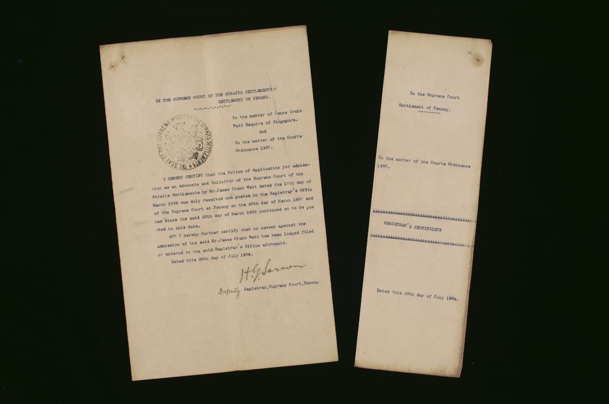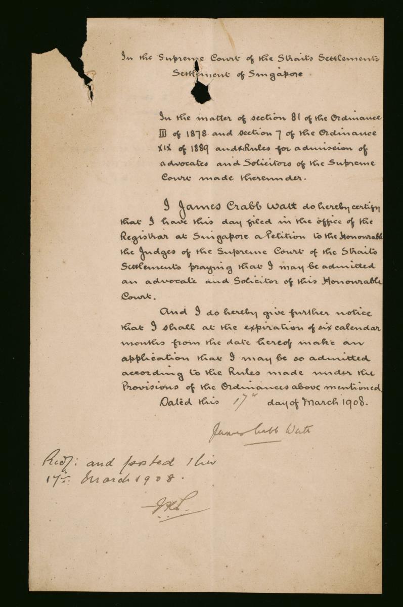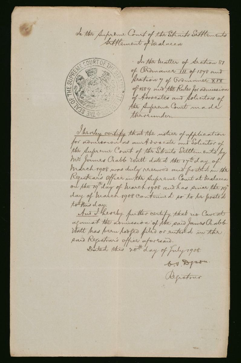 This is a registrar record for James Crabb Watt filed on 27 July 1908 by the Registrar of the Supreme Court of the Straits Settlements, Settlement of Singapore. It is part of a collection of legal documents from the 19th and early 20th centuries which provides a glimpse into the work of the notable personalities who left their mark on Singapore’s legal history, and the economic and other transactions undertaken by ordinary immigrants in 19th century Singapore that tell stories of misfortune and indebtedness which would otherwise have disappeared from history.