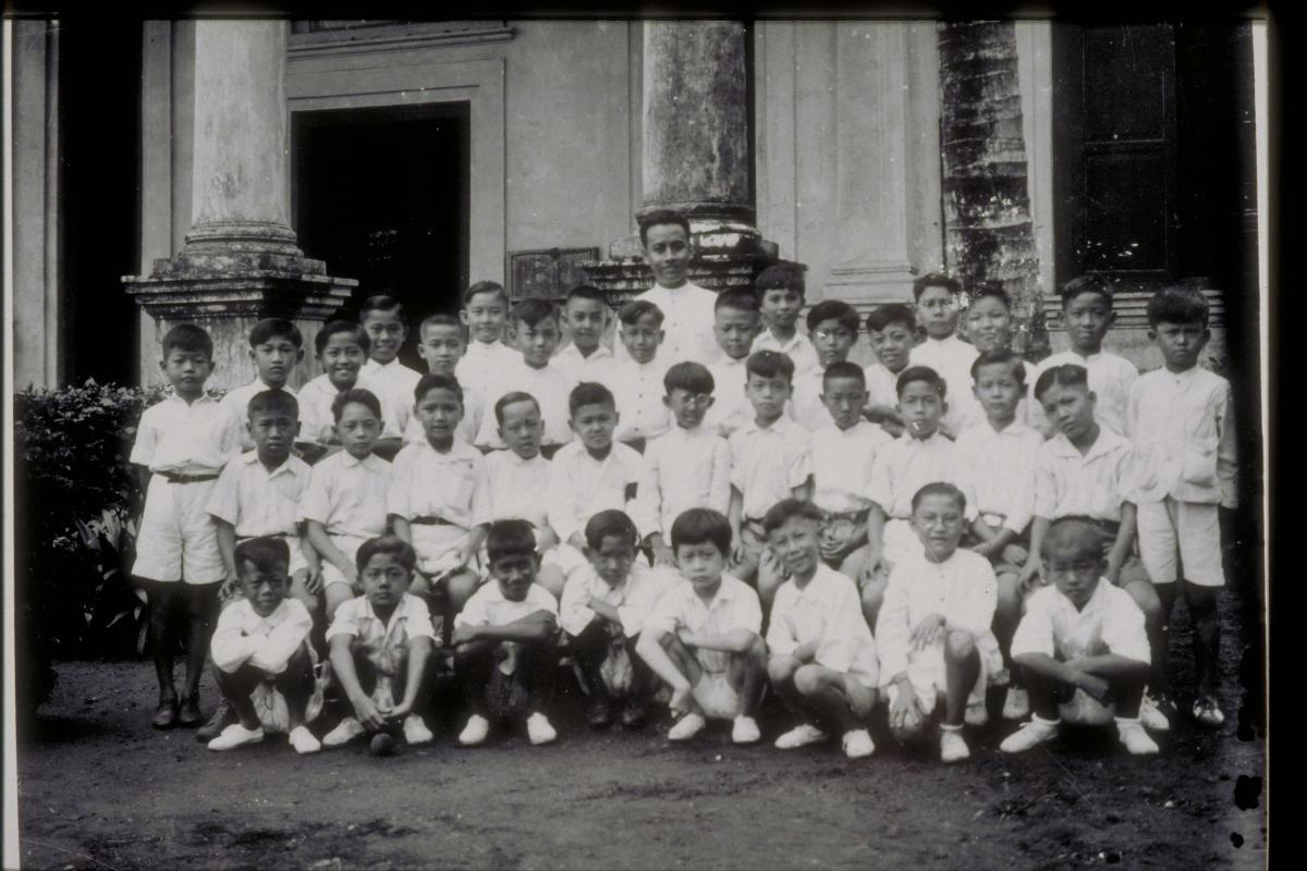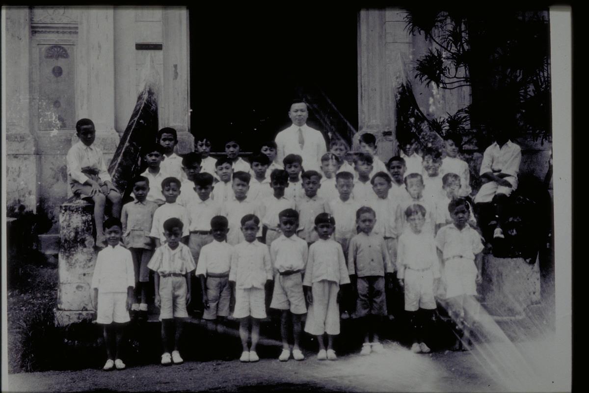 Glass negative depicting teacher Mr Lim Beng Quan and Anglo Chinese School boys at Coleman Street