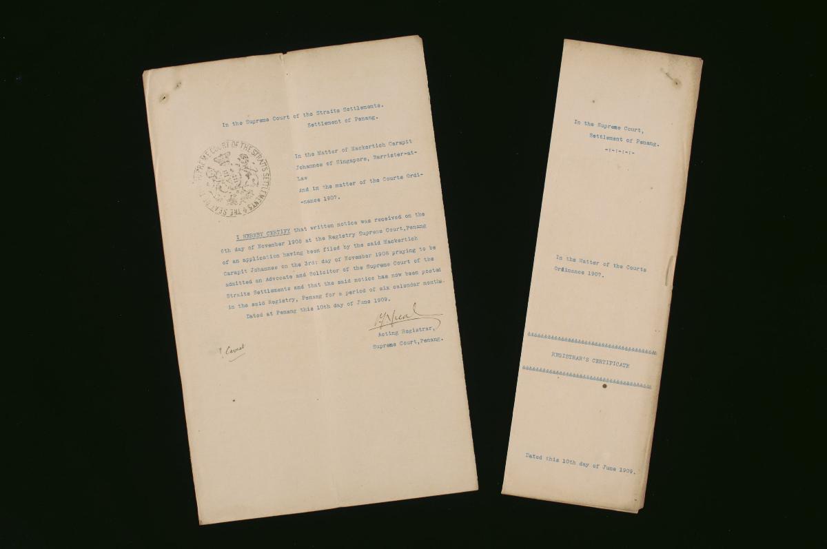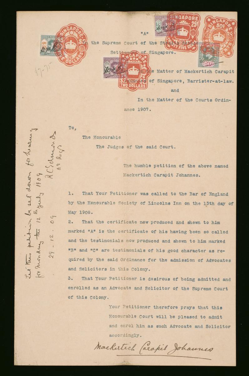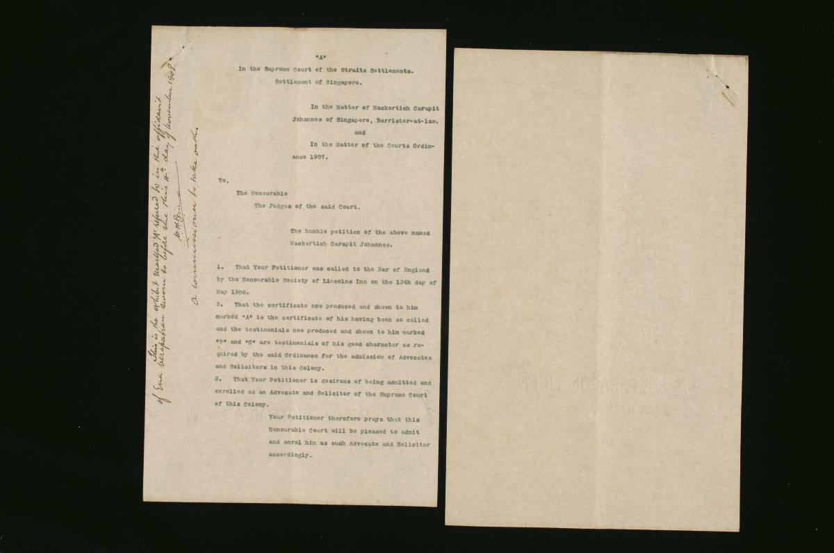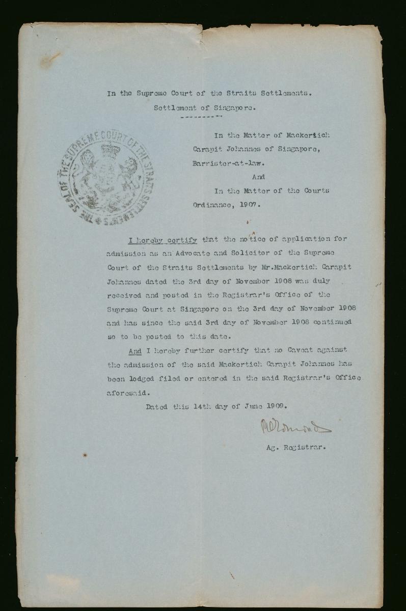 This is a notice filed by Mackertich Carapit Johannes on 3 November 1908 concerning his petition for admission as a solicitor and advocate to the Supreme Court of the Straits Settlements. It is part of a collection of legal documents from the 19th and early 20th centuries which provides a glimpse into the work of the notable personalities who left their mark on Singapore’s legal history, and the economic and other transactions undertaken by ordinary immigrants in 19th century Singapore that tell stories of misfortune and indebtedness which would otherwise have disappeared from history.