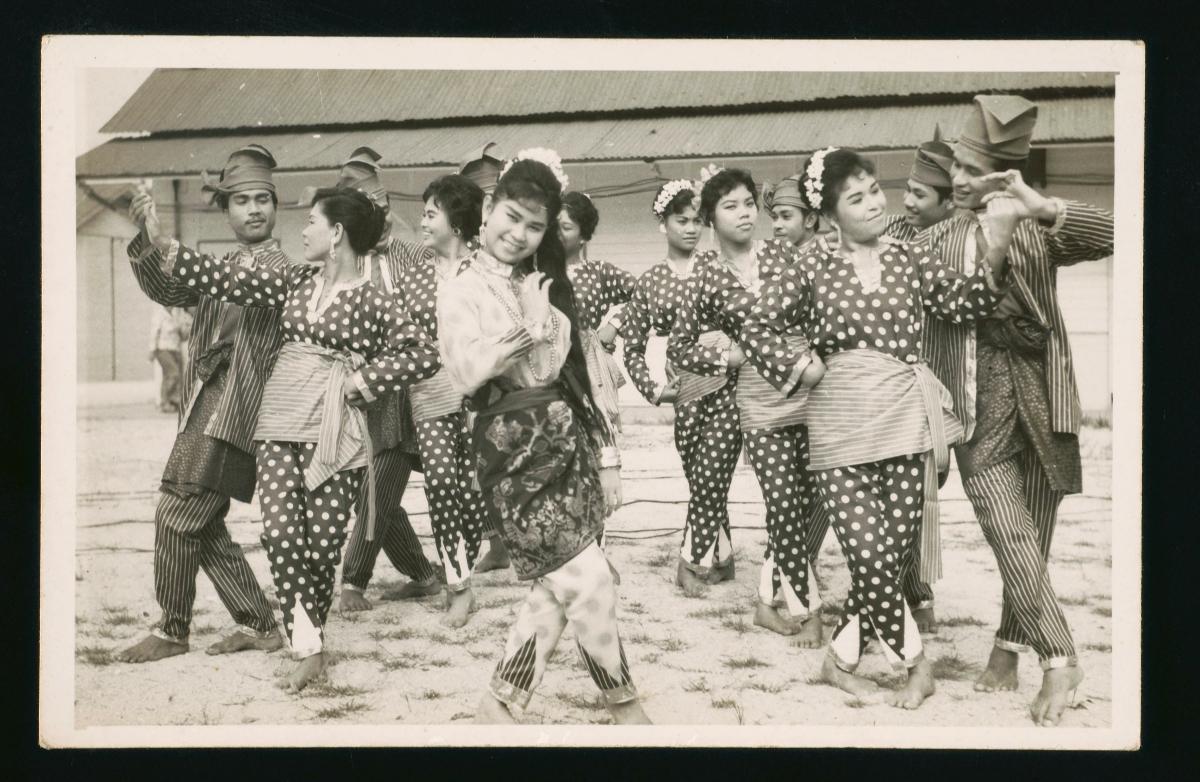The postcard depicts three Malay dancers wearing traditional dance costumes. Known as ’Panji Semerang’, the popular dance cycle was based on the quasi-historical exploits of Panji which originated in east Java.