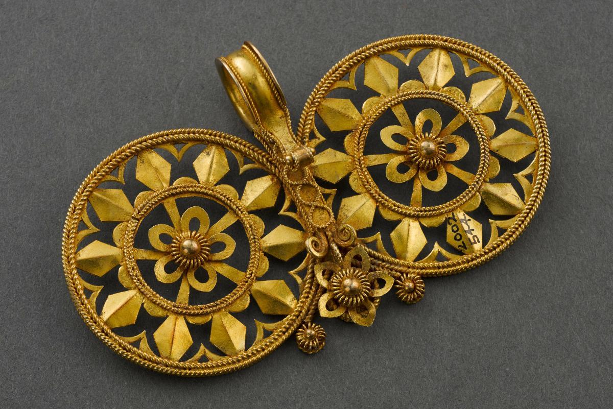 This gold ear ornament was made by rolling a gold strip into an arch which terminates in inward spirals. Such double spiral motif was already used in jewellery dating back to before the Common Era in island Southeast Asia. The double spiral motif continues to appear widely across the archipelago, particularly in tribal societies such as the Batak and Nias.