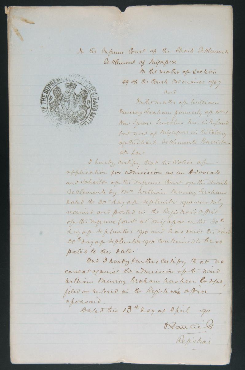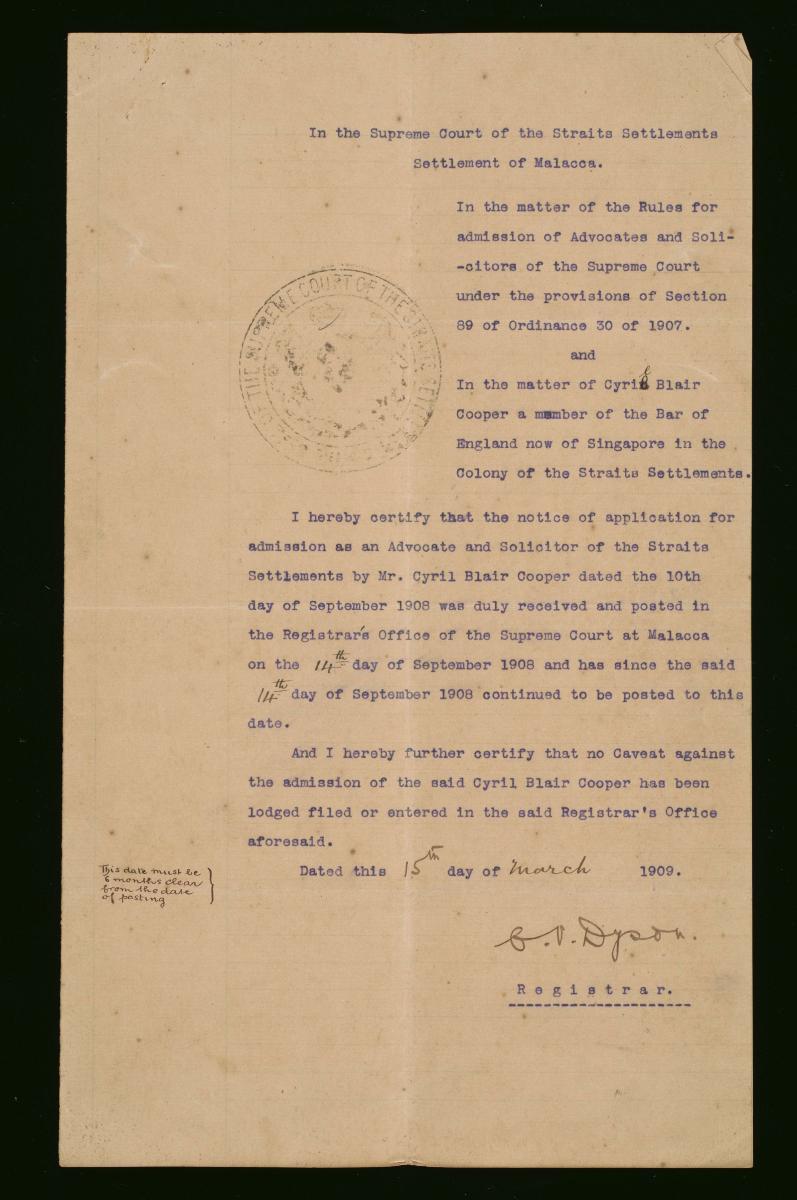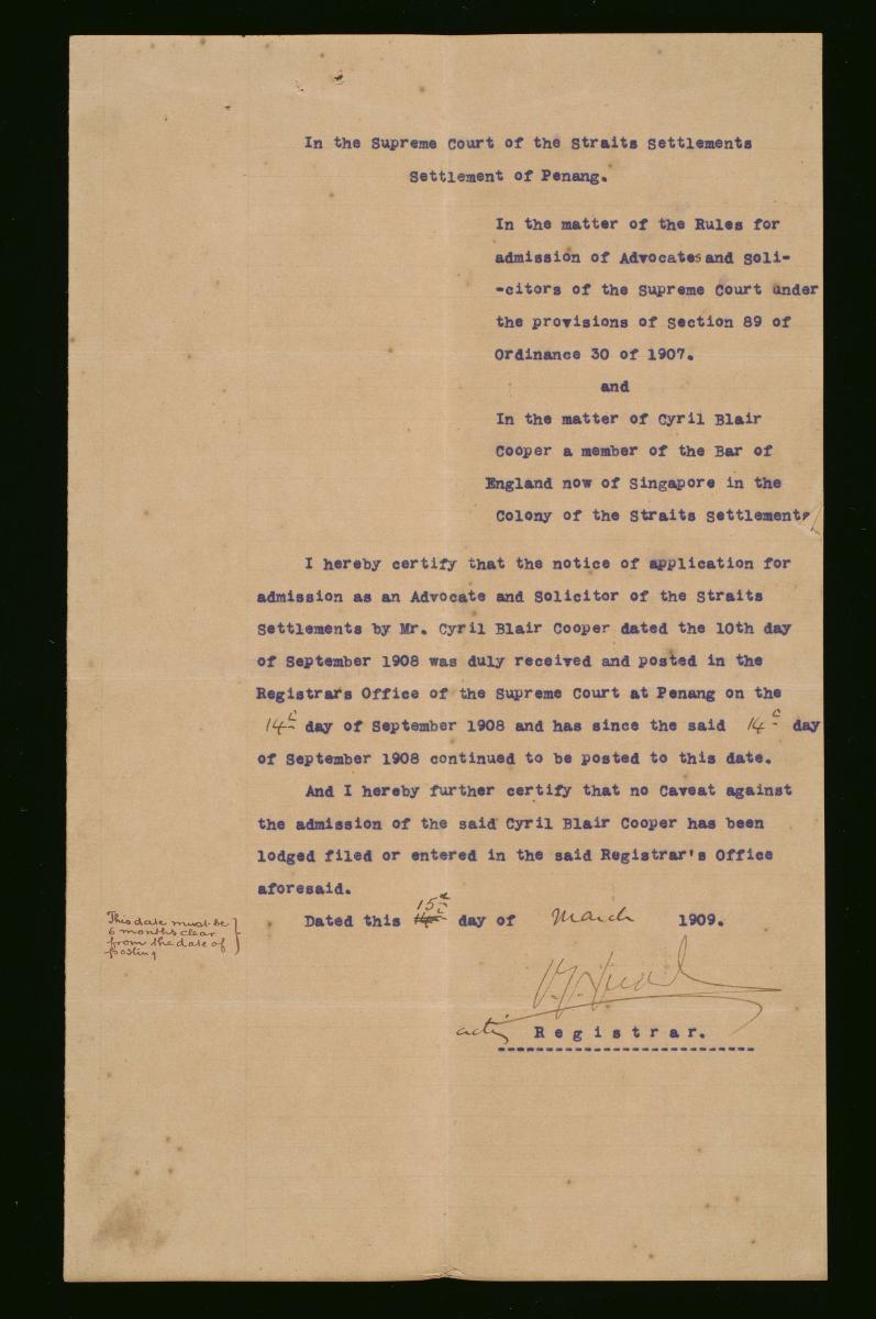 This is a registrar's certificate issued by the Registrar of the Supreme Court of the Straits Settlements, Settlement of Singapore, on 19 March 1909 concerning the petition of Cyril Blair Cooper for admission as a solicitor and advocate of the Supreme Court. It is part of a collection of legal documents from the 19th and early 20th centuries which provides a glimpse into the work of the notable personalities who left their mark on Singapore’s legal history, and the economic and other transactions undertaken by ordinary immigrants in 19th century Singapore that tell stories of misfortune and indebtedness which would otherwise have disappeared from history.