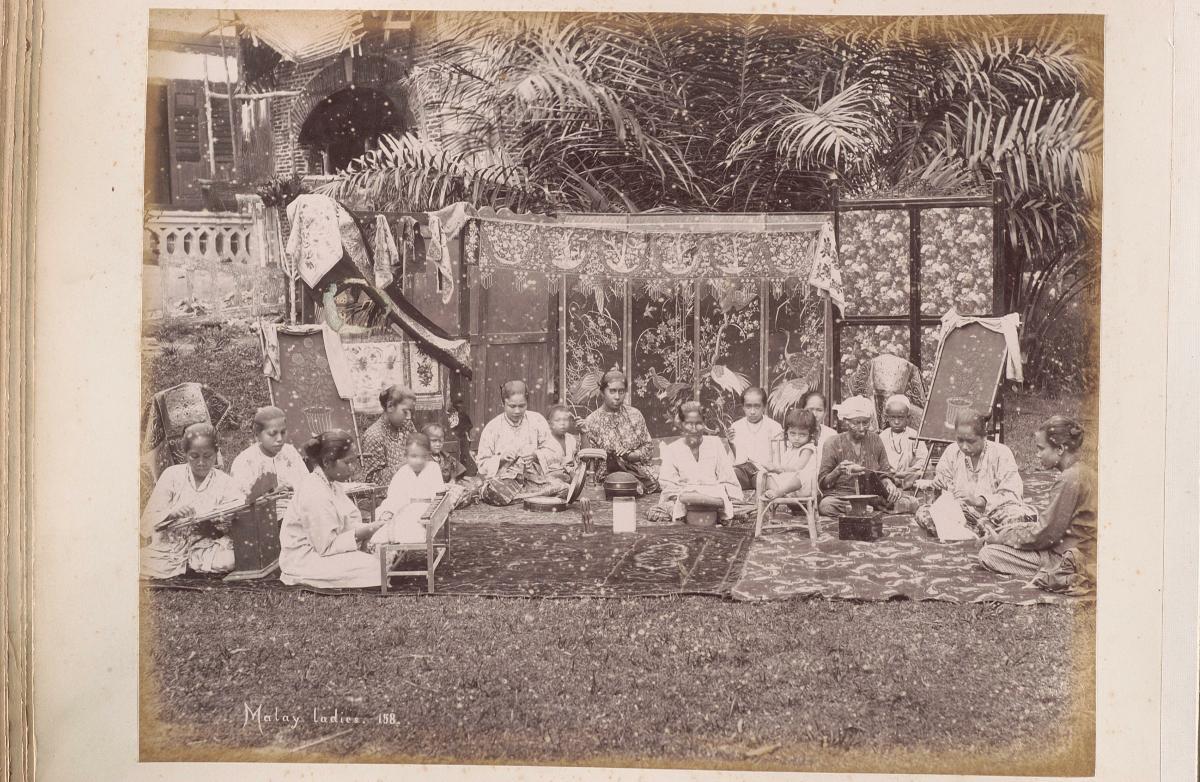 A group of Malay women are depicted demonstrating various aspects of the art of weaving. On the left, the women are working on small handlooms while the rest are engaged in delicate embroidery. The photograph was carefully arranged to portray as much as possible. This is made evident by the various examples of embroidered silks and cottons placed behind the group of women. Photographic compositions such as this were popular souvenirs for visitors in Singapore and Malaysia.