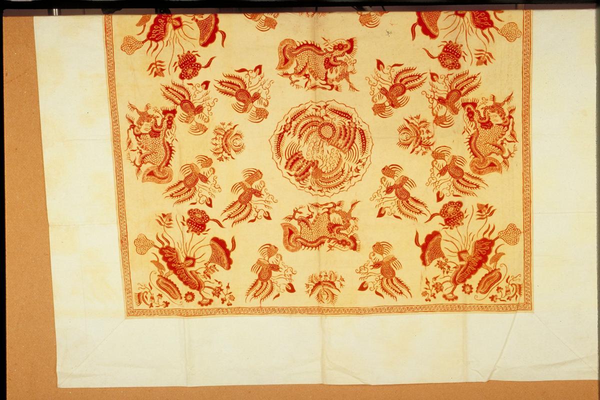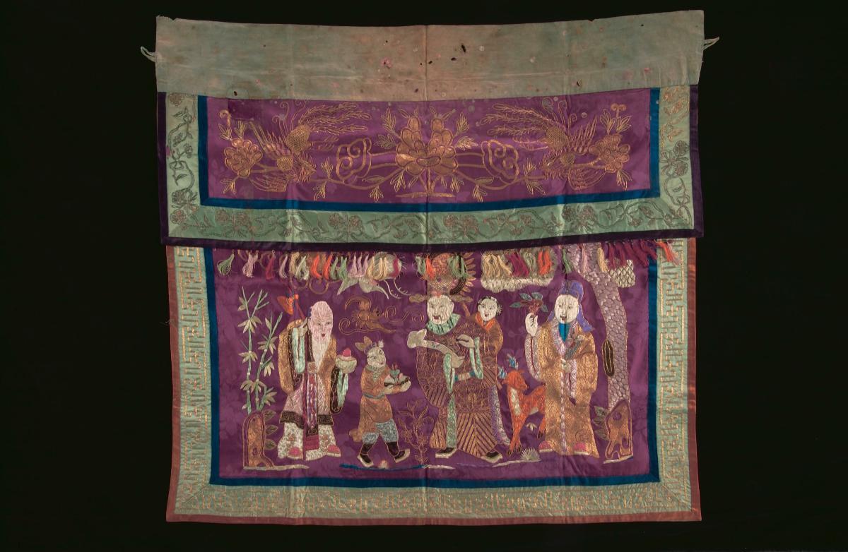 This ‘tok wi’ (literally 'table skirt' in Chinese) is the Baba Malay term for the cloth attached to the front of altar tables during significant occasions such as weddings, funerals and on feast days. The elaborately embroidered design in silk with gold thread couching on a silk base incorporates the auspicious motifs of the dragon and ‘Hock Lock Siew’ (福禄寿, ‘Fu Lu Shou’ in Hokkein), the three gods of good fortune, prosperity and longevity. The red background, in addition to the auspicious motifs, indicates this piece was used on festive occasions. This altar cloth was made in China and was used by the Peranakan Chinese in Singapore and Malacca.