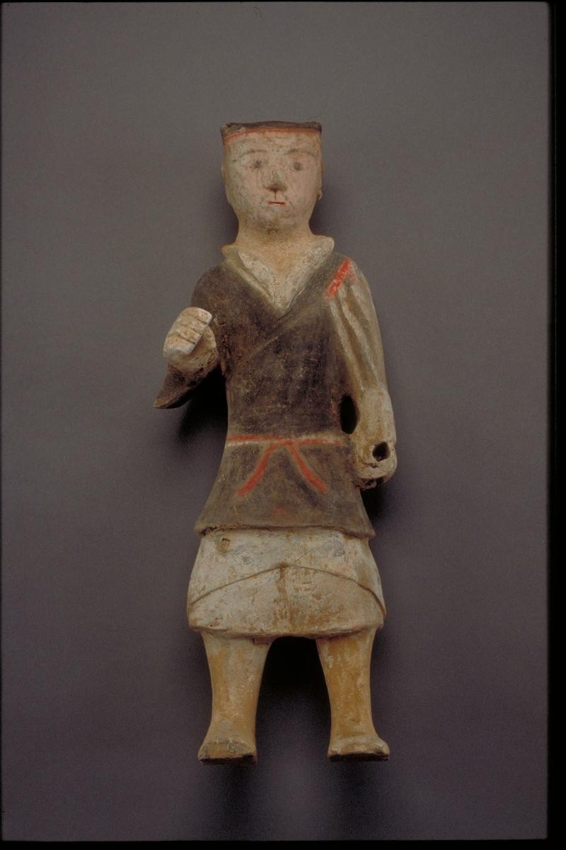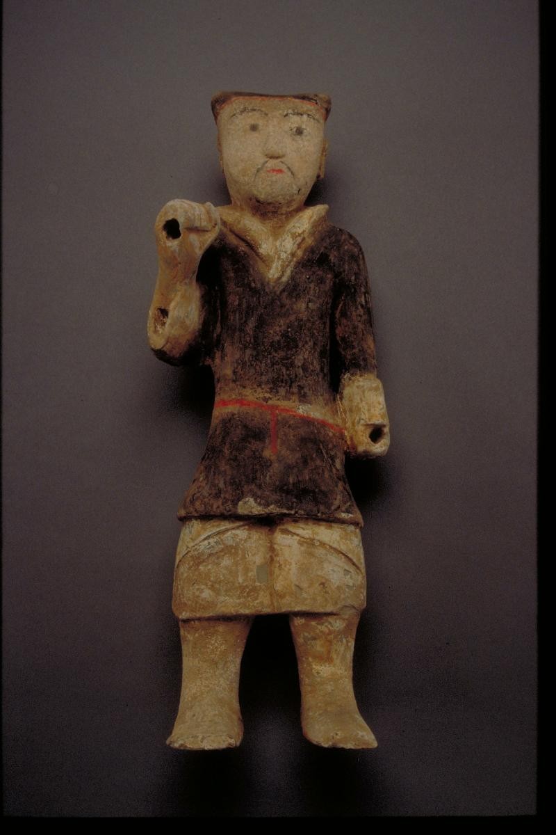 This figurine of a Han retinue soldier is wearing a red tunic with a breast-plate and baggy trousers. The holes around the hand area and his hand position suggest that he was probably carrying some military equipment in his hands previously. Instead of human sacrifices, Han warriors such as this were substituted and most likely used as burial goods or ‘mingqi’ for a rich and influential Han person. It is thought that such wares were necessary for the deceased in the next world. Elaborate groups of burial wares were also a display of wealth and social status.Such Han warriors are very similar to the large retinue of pottery soldiers found at the famous Yangjiawan site in northeastern Xianyang in Shaanxi province, China. Artefacts excavated from this particular site were dated to be between 179 to 141 B.C.E.
