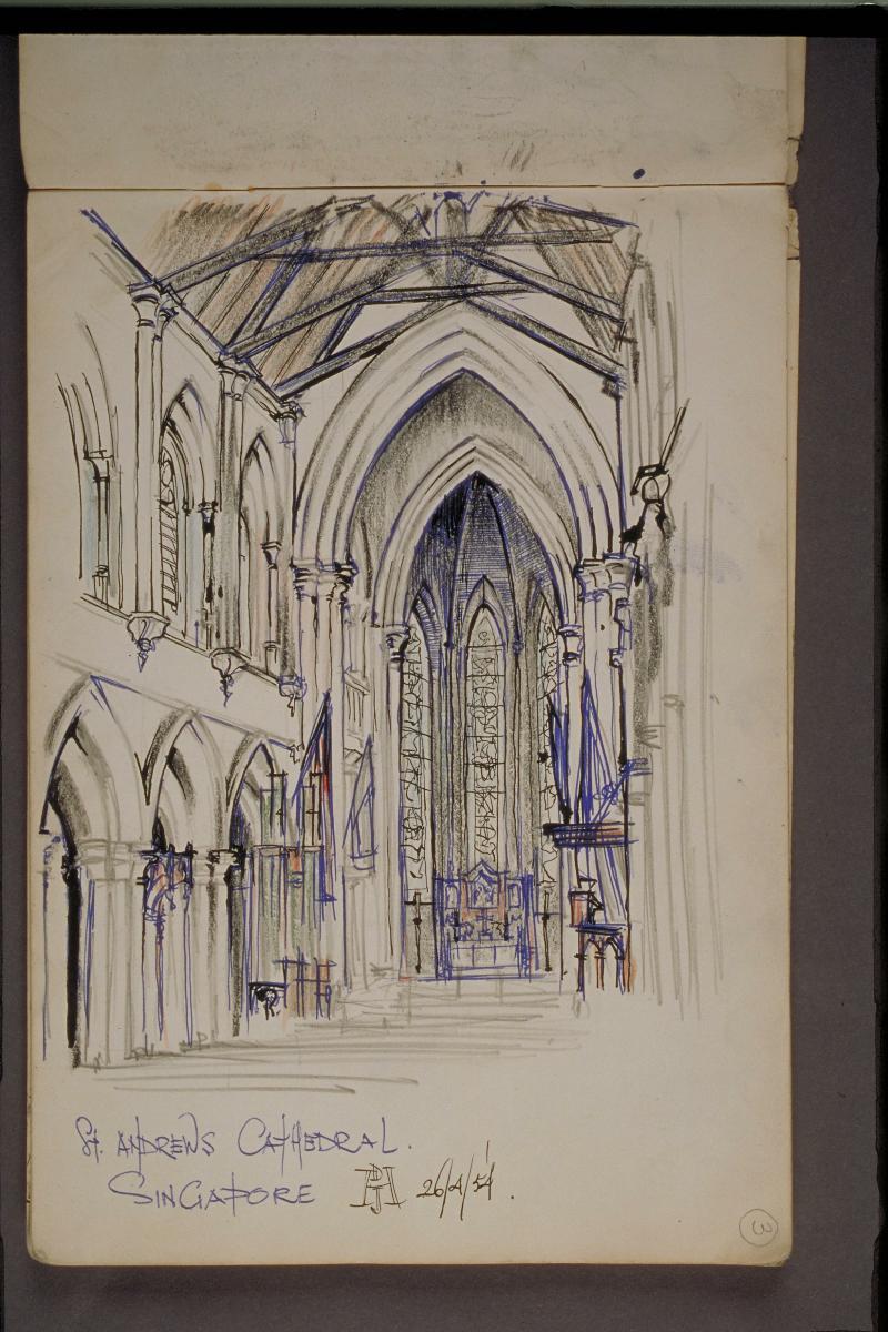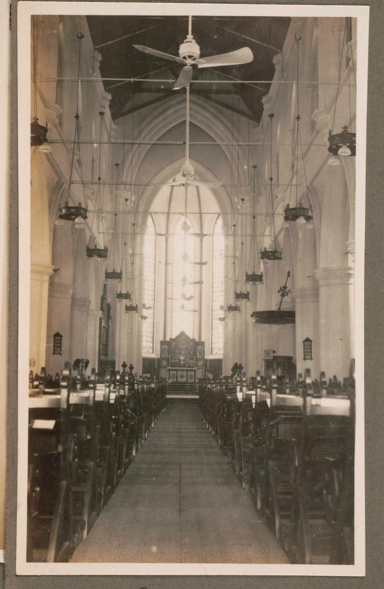 Seen here is the St. Andrew’s Cathedral’s interior, noteworthy for its vaulted ceiling, as one looks westwards towards the entrance. Designed by Lieutenant-Colonel Ronald Macpherson, who was the Executive Engineer and Superintendent of Convicts in Singapore from 1855 to 1857, the cathedral was completed under the supervision of Major John Frederick Adolphus McNair, Civil Engineer John Bennett and Superintendent of Works, William Daniel Bayliss. Following closely the design of the famed Salisbury Cathedral with its lancet windows, turret-like pinnacles and decorated spire, the Church held its first service on 1 October 1861 and was consecrated on 25 January 1862. By 1870, it had been elevated to the status of a Cathedral.