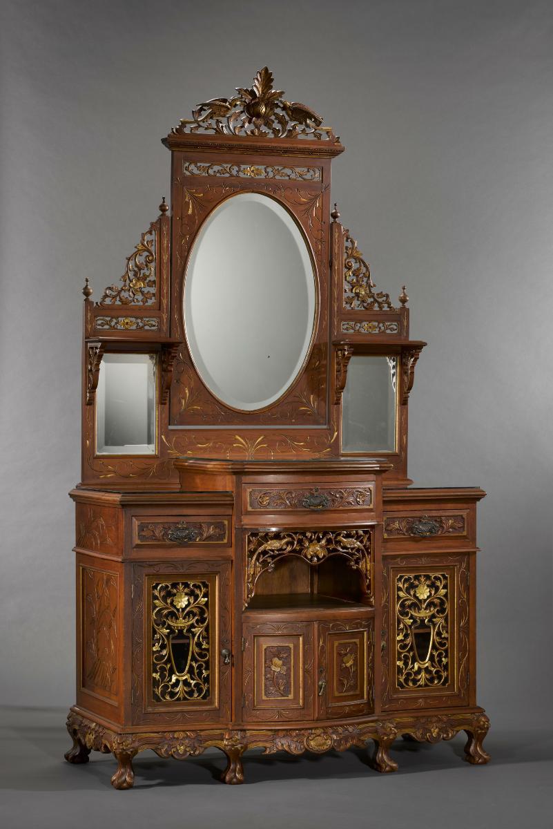 A dressing table was part of a set of furniture traditionally given to a bride upon marriage by her own parents. The cabinets and drawers in such tables were used to store face powder, combs, brushes and other personal items. By the early 20th century in Singapore, most dressing tables were made of teak, a wood widely used locally for making furniture. This piece is carved, engraved and embossed with English motifs favoured by the Peranakan Chinese in the early 20th century.