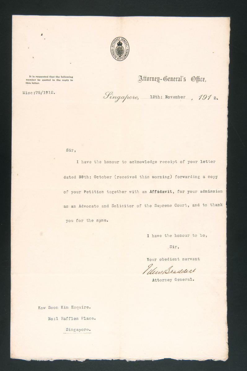 This is a letter dated 15 April 1913 from the Acting Attorney General of the Straits Settlements, Evelyn Campbell Ellis, to Kow Soon Kim, acknowledging receipt of a previous letter and copies of Kow's petition and affidavit. It is part of a collection of legal documents from the 19th and early 20th centuries which provides a glimpse into the work of the notable personalities who left their mark on Singapore’s legal history, and the economic and other transactions undertaken by ordinary immigrants in 19th century Singapore that tell stories of misfortune and indebtedness which would otherwise have disappeared from history.
