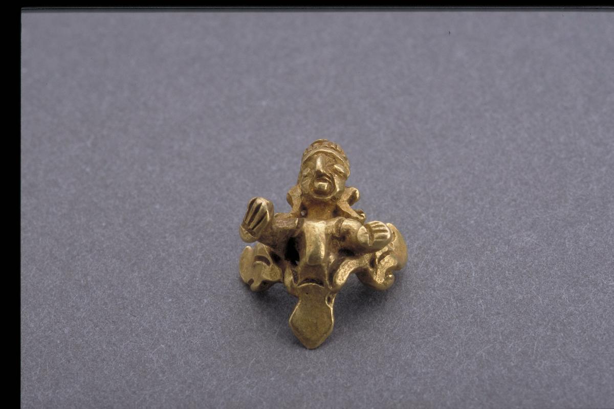This ear ornament features Garuda, the half-bird, half-human mount of Vishnu. Both men and women wore ear ornaments and they had their earlobes pierced. Although India-derived symbols were used in Javanese jewellery during this period of time, the nature of that interaction between indigenous and Indian culture remains a subject of debate. Besides jewellery, gold was also used to make religious items.