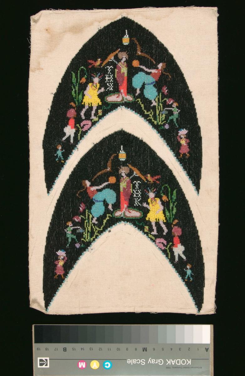 These incomplete slipper faces illustrate satin-stitch embroidery and beadwork executed in petit point (a technique derived from European cross-stitch).Embroidered slippers (particularly those with metallic thread on velvet) are generally considered to be precursors to the 'kasut manek' (beaded slippers). Pieces bearing metallic-thread embroidery were often worked on a velvet base, as this was a fabric sturdy enough to withstand the weight of metallic thread. The technique of stitching involves anchoring each bead onto an even-weave fabric using the petit-point stitch derived from cross-stitch. For added relief and texture, pre-cut cardboard designs were sometimes pasted onto the fabric before working a simple satin-stitch over them. The ‘raised’ effect showed the smooth sheen of the embroidery to great effect.