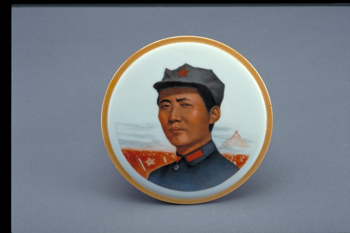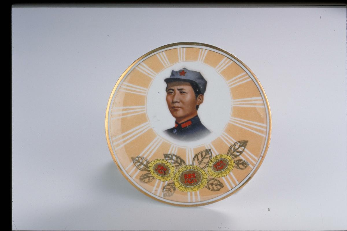 This plaque was produced to commemorate the 20th anniversary of the founding of the People’s Republic of China. It features a popular image of a youthful Mao dressed as both a scholar and a soldier. To avoid being seen as counter-revolutionary, people producing Cultural Revolution materials often re-used standard images of Mao and combined them with other approved motifs. This can be seen in the two plaques featuring Mao in a Red Army uniform. In this one, he is presented as the symbol of communist China, standing before a sea of red flags. In the other (see 1997-04867), he is likened to the sun whose light shines upon the sunflowers, which symbolise the Chinese people.