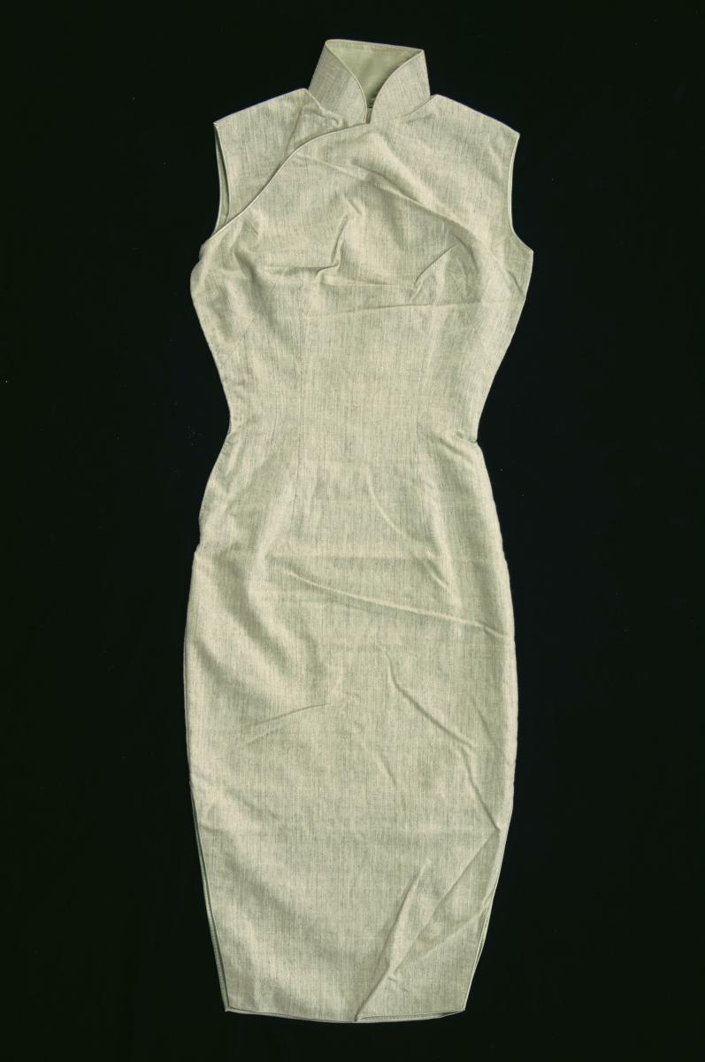 This is a green sleeveless cheongsam with a floral motif all over. It is figure-hugging and tapered at the bottom, giving the wearer a pencil-slim silhouette.