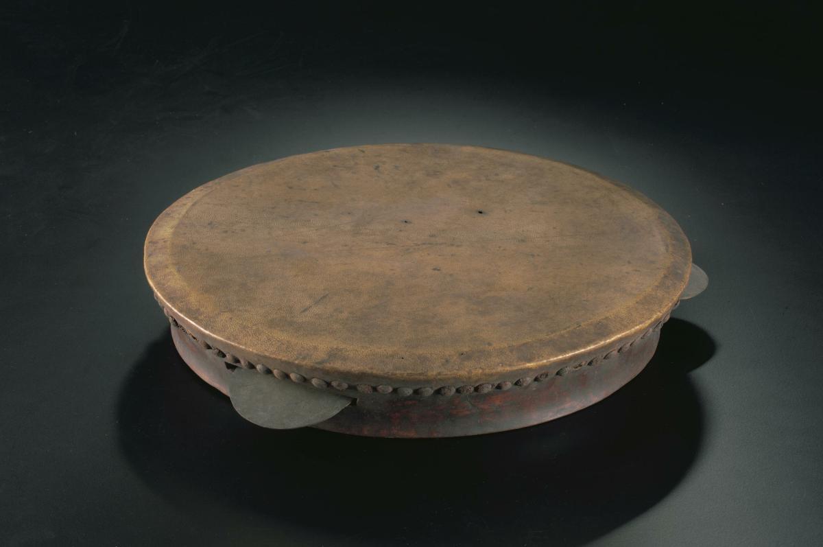 This drum face is decorated with a 12 pointed star at the centre, surrounded by concentric decorative bands. These include a band with motifs of men wearing feather headdresses and water-birds. These and the four frogs indicate the drum that was used for rituals associated with calling for rain and good harvests. The drum is a classic example found in Dong Son culture burials, with many other types of ritual bronze objects in the Red River Delta region. The sophisticated lost wax and other bronze-casting technologies that were used, suggest that Dong Son society was advanced enough to have specialists who would have worked full-time in this field. The effects of this were to be seen in the spread of bronze goods and technology throughout the Southeast Asian region.