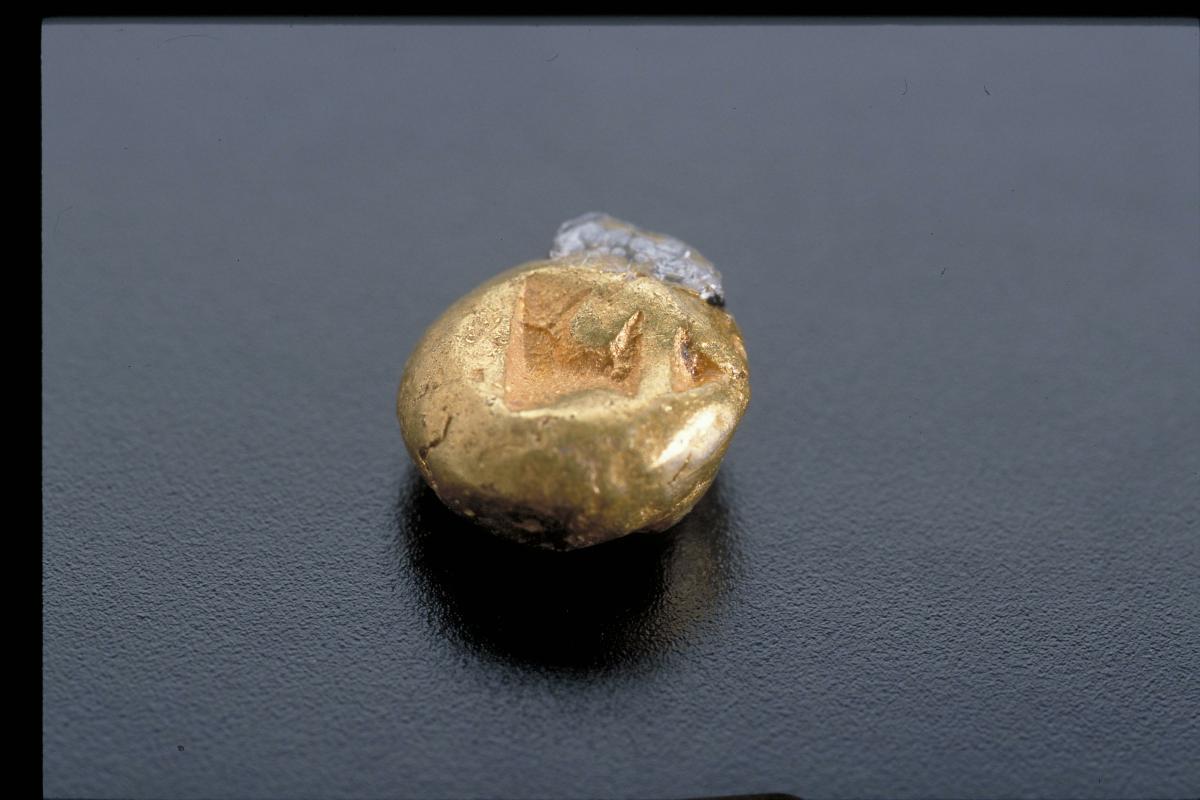 This gold coin, also known as ‘piloncito’, is shaped like a flattened dice. It is stamped on one side to produce a rounded depression with a line down the middle, and a single raised dot on either side of this line. On the reverse side, it may be inscribed with Sanskrit characters, curves, or grid marks. Javanese coins were used as currency around the 7th century to about 1350, when Chinese bronze coins replaced them as the main medium of exchange.