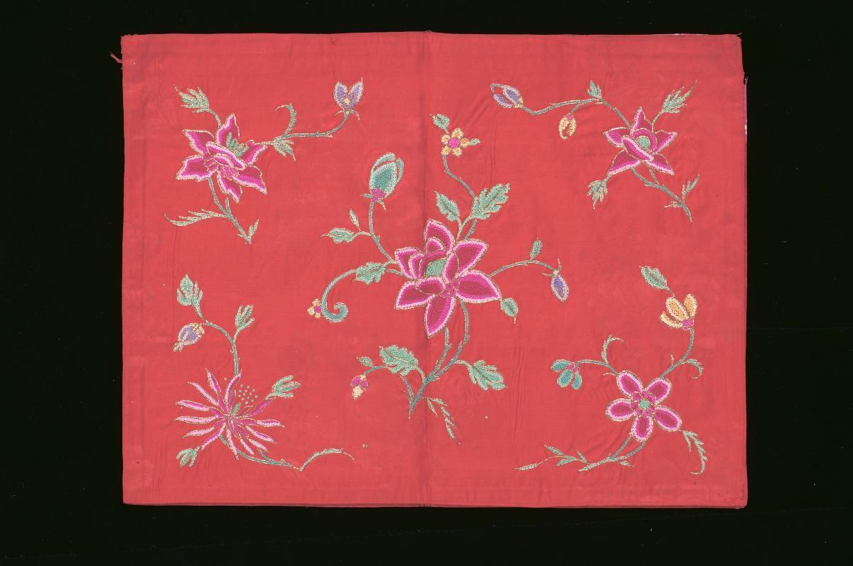 This pair of cushions is ornately decorated with auspicious symbols in bead work. The glass beads used in the bead work were probably imported from Europe. The decorative motifs on these cushions include peony flowers, phoenix and pairs of butterflies. Peonies symbolise spring, love, beauty and good fortune while the phoenix can represent beauty, grace, high virtue, the Empress and the bride. In the same vein, butterflies are symbols of joy, beauty, romance and thus associated with weddings.