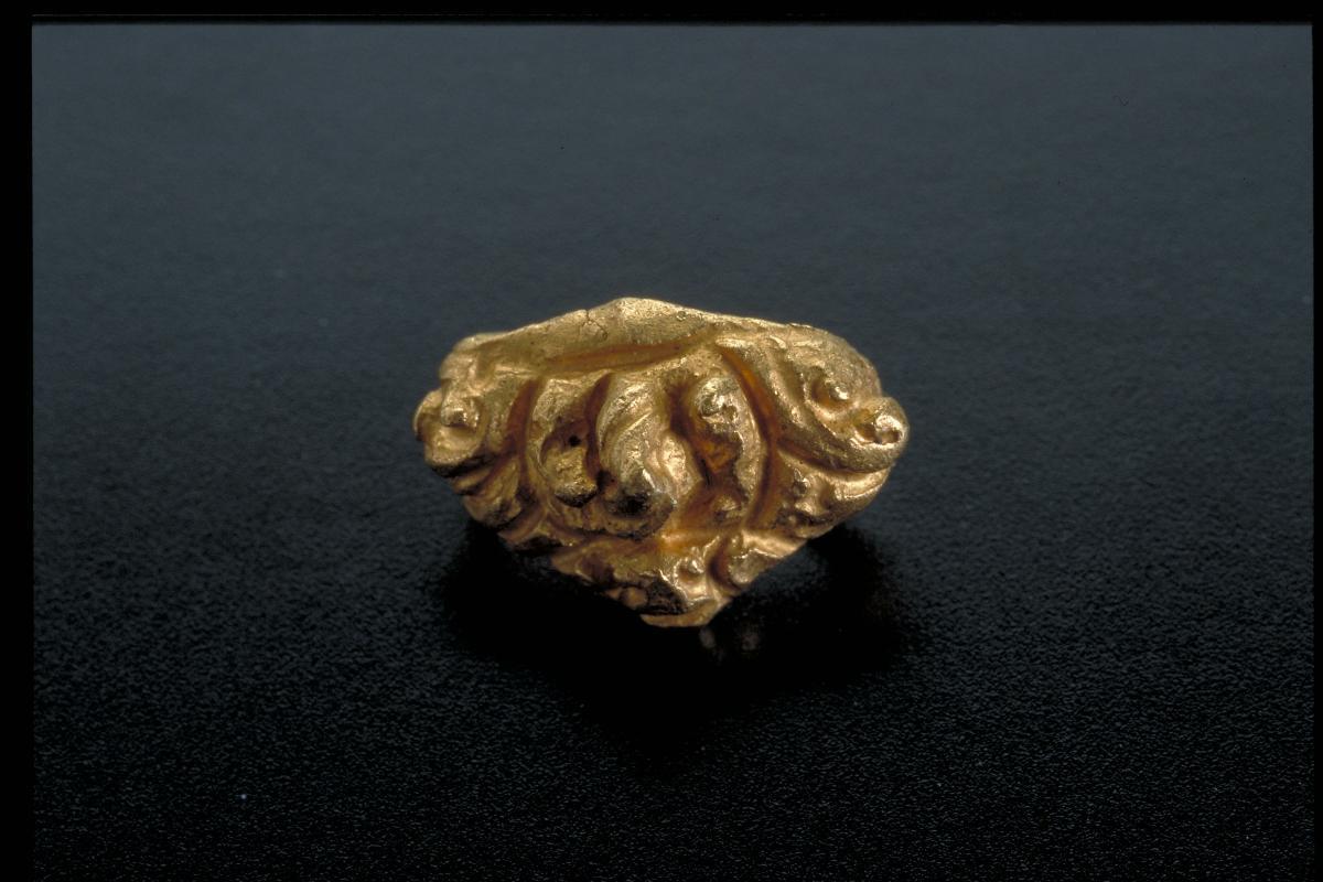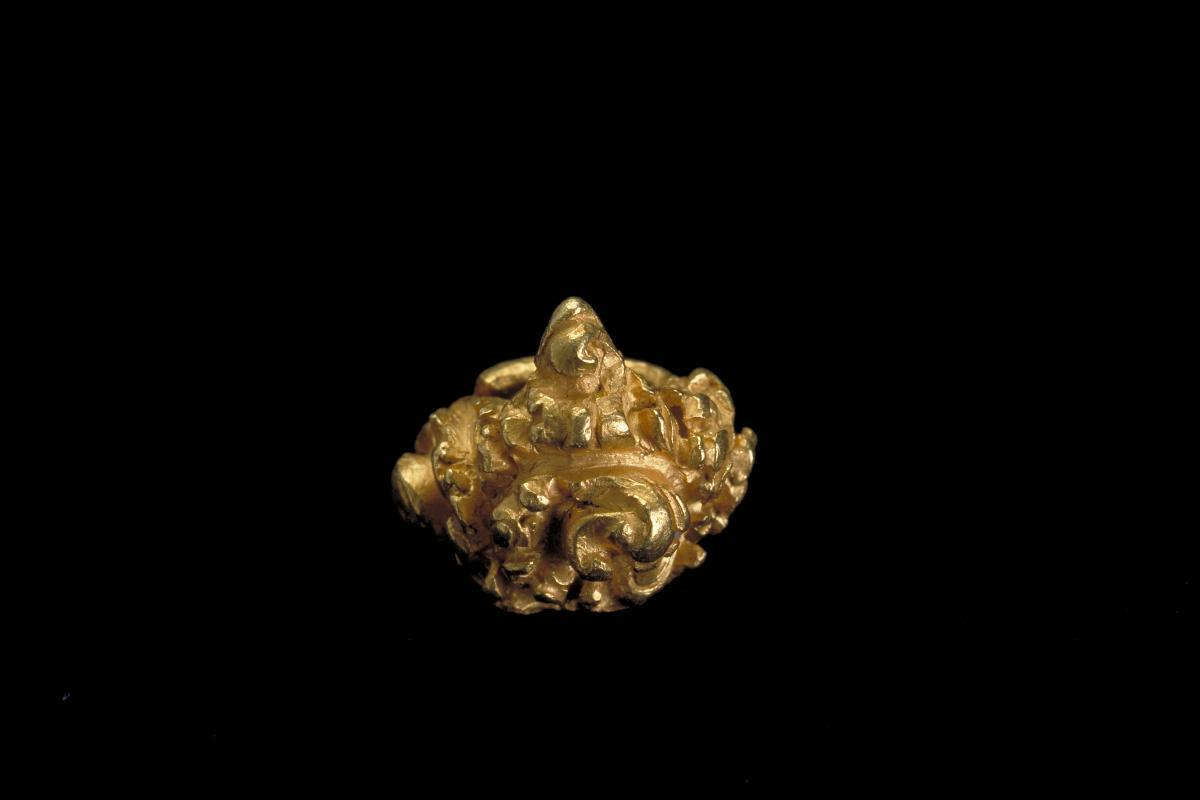 This cast ear ornament in the shape of a mountain is an example of Javanese goldwork from the pre-classical to the central and east Javanese periods. Indo-Javanese period ornaments frequently take on forms inspired by Hindu-Buddhist iconography such as the lotus, Kala and Hanuman figures. The level of sophistication reached its peak in this period during which a combination of wax casting and goldwork produced objects with incredible detailing.