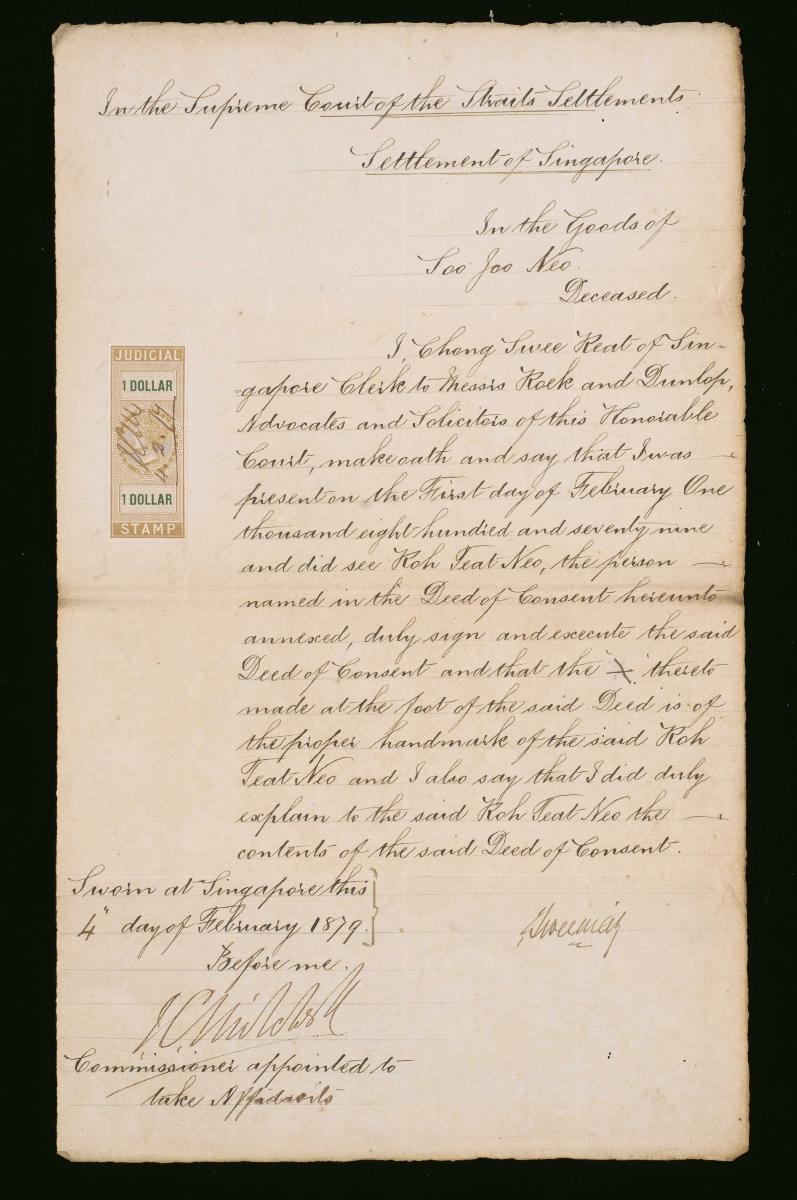 This is a document concerning the administration of the estate of the deceased Soo Jew Neo dated 23 December 1878. It states that no action was to be taken with regards to the estate of the deceased without the knowledge of Edwin Koek and Charles James Tennant. It is part of a collection of legal documents from the 19th and early 20th centuries which provides a glimpse into the work of the notable personalities who left their mark on Singapore’s legal history, and the economic and other transactions undertaken by ordinary immigrants in 19th century Singapore that tell stories of misfortune and indebtedness which would otherwise have disappeared from history.