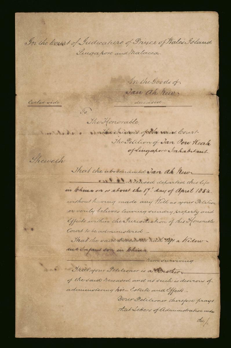 This is the petition of Tan Ah Kwah concerning the administration of the estate of the deceased Tan Ah Chin. It is part of a collection of legal documents from the 19th and early 20th centuries which provides a glimpse into the work of the notable personalities who left their mark on Singapore’s legal history, and the economic and other transactions undertaken by ordinary immigrants in 19th century Singapore that tell stories of misfortune and indebtedness which would otherwise have disappeared from history.