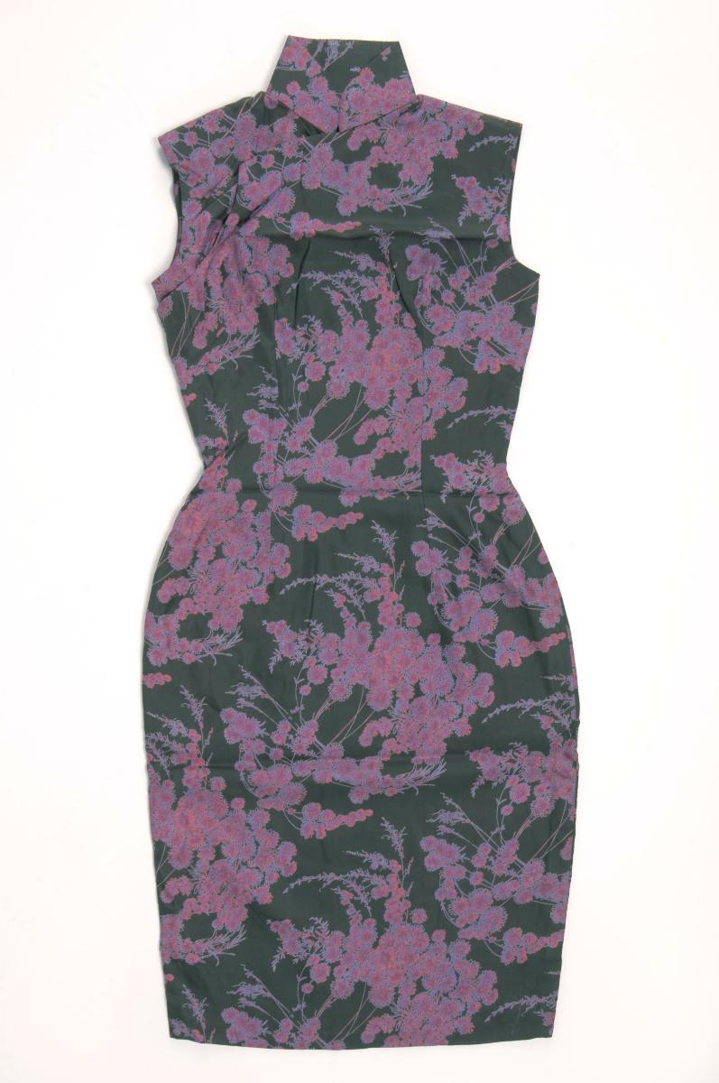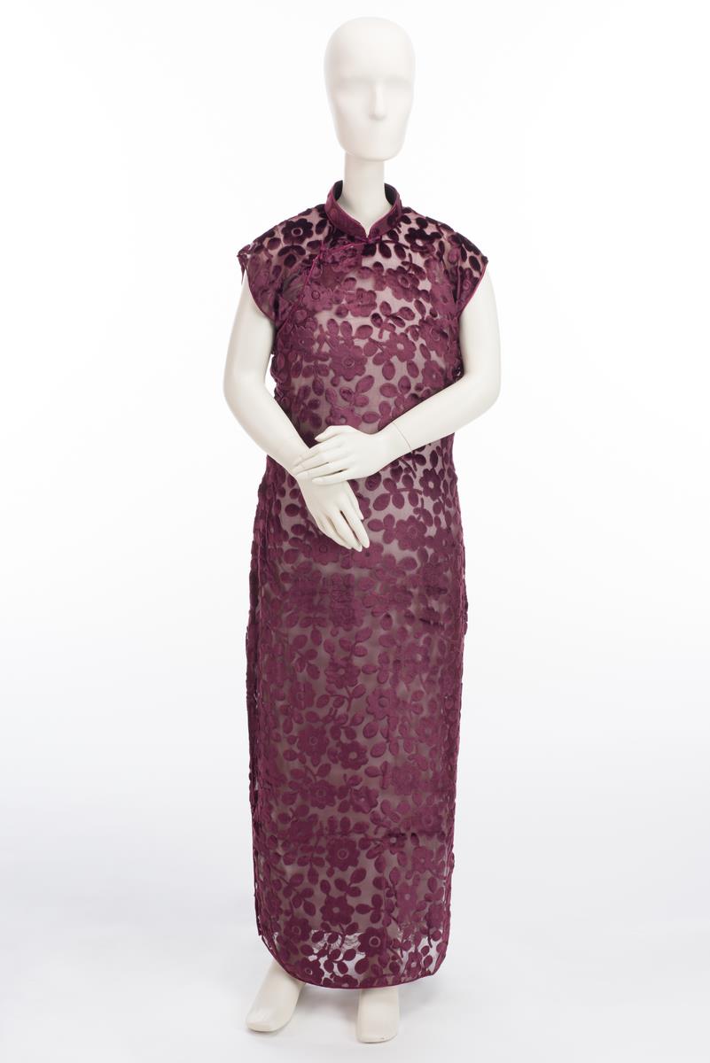 This is a black cheongsam with an embroidered purple floral motif down the right bodice. This piece has a nipped-in waist, which was popular in the 1950s and 1960s. The flap on the right-hand side is secured by press studs while the zipper is at the side. This cheongsam belonged to Mdm. Wu Chuen Chuen, who enjoyed wearing it to work and parties, often with a corset underneath to achieve the desired hourglass figure. A leading businesswoman of her time, Mdm. Wu ran the former Stamford Café at Bras Basah Road for 30 years before it closed in the 1970s.