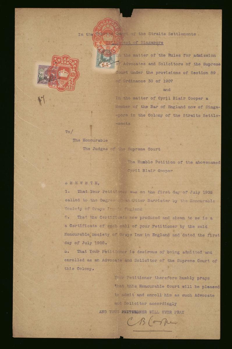 This is the declaration of Cyril Blair Cooper made on 10 September 1908. It is part of a collection of legal documents from the 19th and early 20th centuries which provides a glimpse into the work of the notable personalities who left their mark on Singapore’s legal history, and the economic and other transactions undertaken by ordinary immigrants in 19th century Singapore that tell stories of misfortune and indebtedness which would otherwise have disappeared from history.