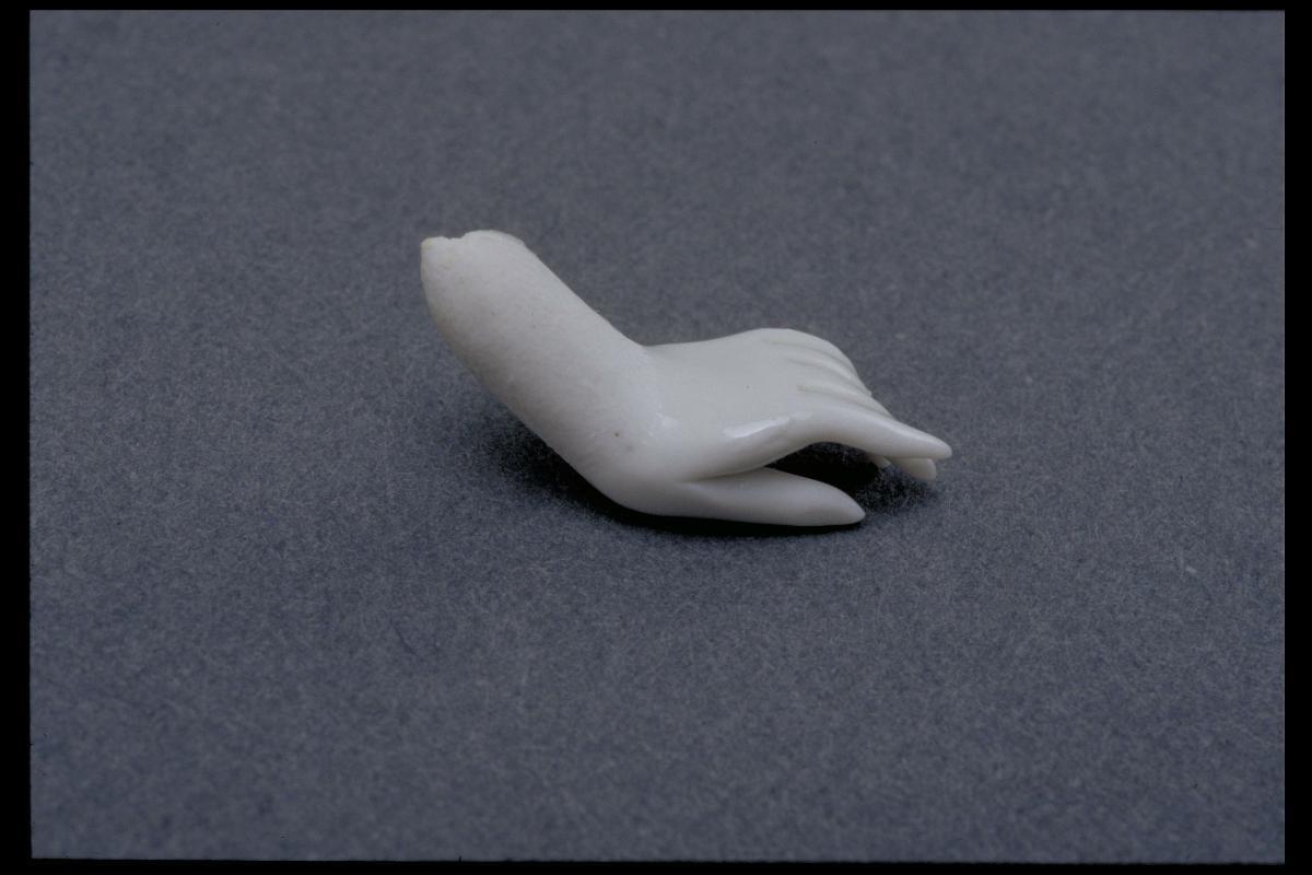 This piece covered in pure white glaze was made to be inserted into the arms of religious figures possibly as a replacement for those that broke. Modelled by hand, the attention to details is typical of figurative pieces at the time.Dehua, a district in Fujian province, is the production centre for white porcelain, which is known to the Chinese as 'zhuyoubai' (pork-grease white) or 'xiangyabai' (ivory white), and to the Europeans, 'blanc de Chine' (white porcelain). As these names suggest, Dehua porcelain has a white body, consisting predominantly of porcelain stone ('baidunzi') with minute amounts of clay. This porcelain was produced as early as the 14th century. However, production and quality peaked in the 17th century. A variety of techniques, including press-moulding and slip-casting, were used to create a wide repertory of wares. This ranged from religious figurines to scholar’s objects and enamelled wares.