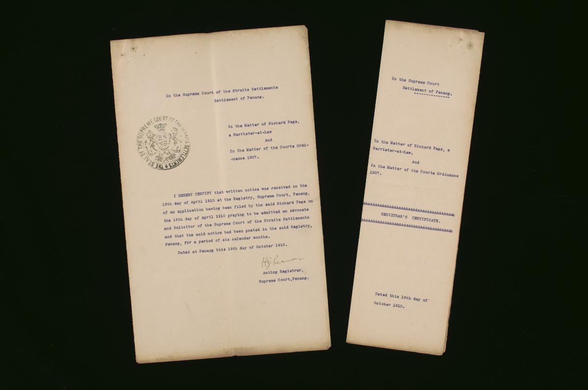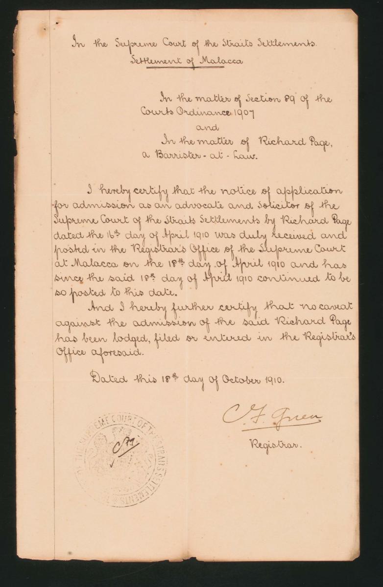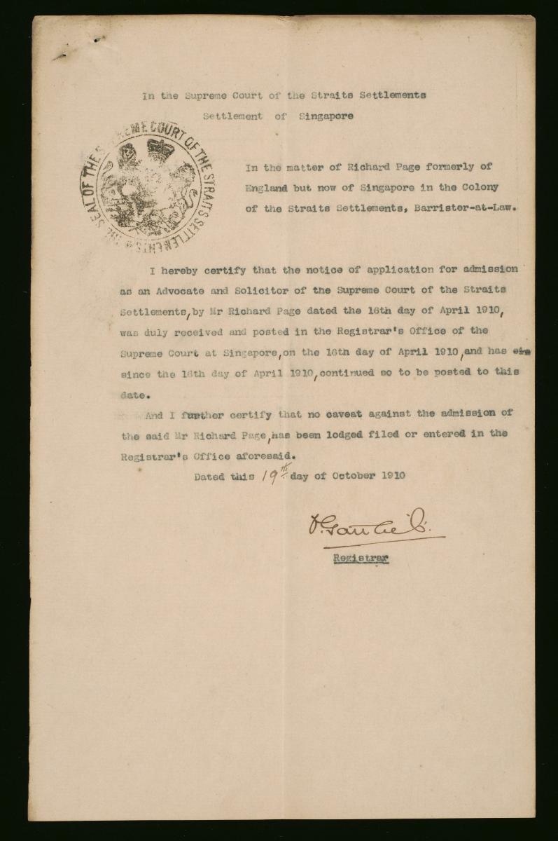 This is the petition of Richard Page for admission as a solicitor and an advocate of the Supreme Court of the Straits Settlements filed on 16 April 1910. It is part of a collection of legal documents from the 19th and early 20th centuries which provides a glimpse into the work of the notable personalities who left their mark on Singapore’s legal history, and the economic and other transactions undertaken by ordinary immigrants in 19th century Singapore that tell stories of misfortune and indebtedness which would otherwise have disappeared from history.