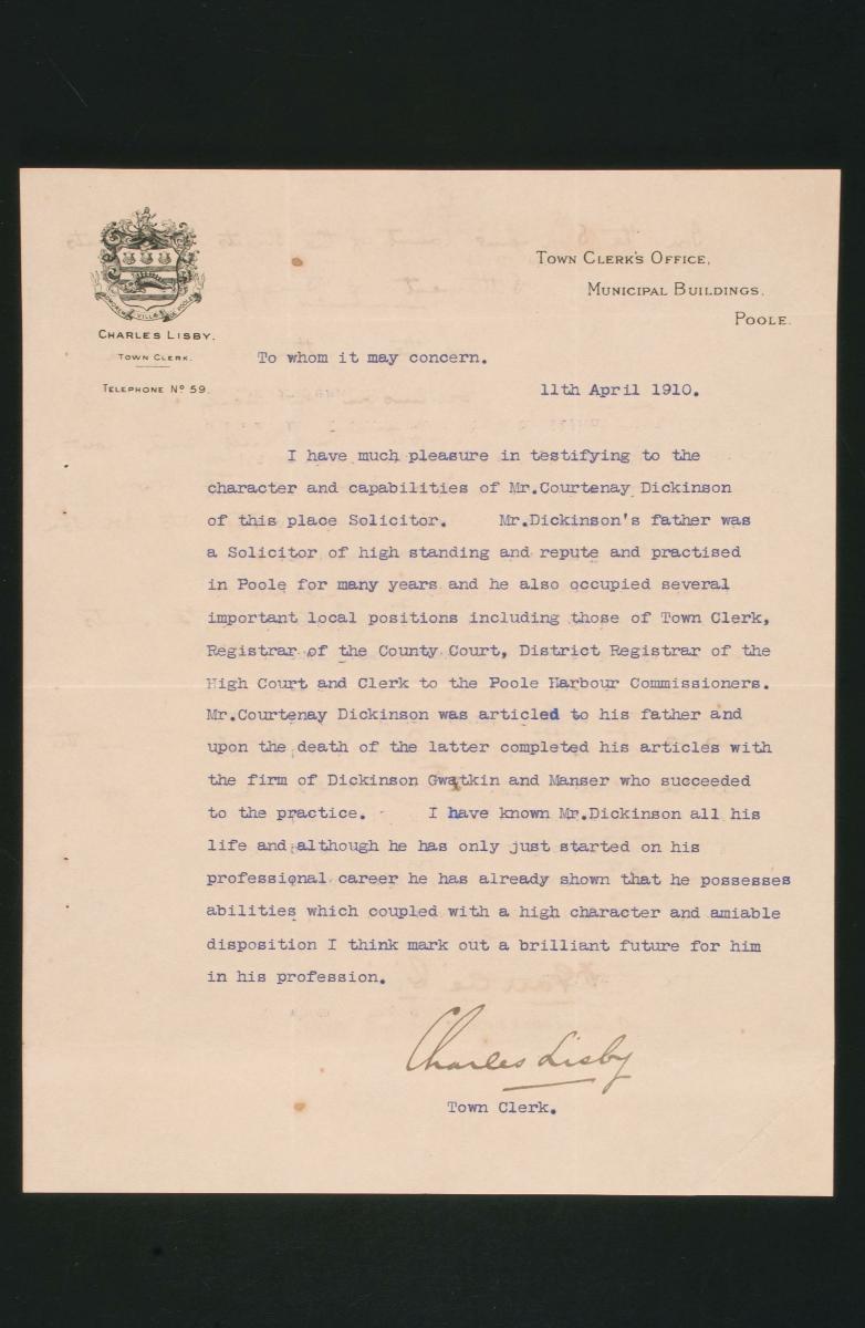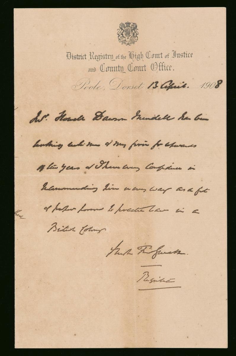 This is a testimonial dated 12 April 1910 for Courtenay Dickinson from the Registrar of the District Registry of the High Court of Justice and County Court Office in Poole, Dorset. It is part of a collection of legal documents from the 19th and early 20th centuries which provides a glimpse into the work of the notable personalities who left their mark on Singapore’s legal history, and the economic and other transactions undertaken by ordinary immigrants in 19th century Singapore that tell stories of misfortune and indebtedness which would otherwise have disappeared from history.