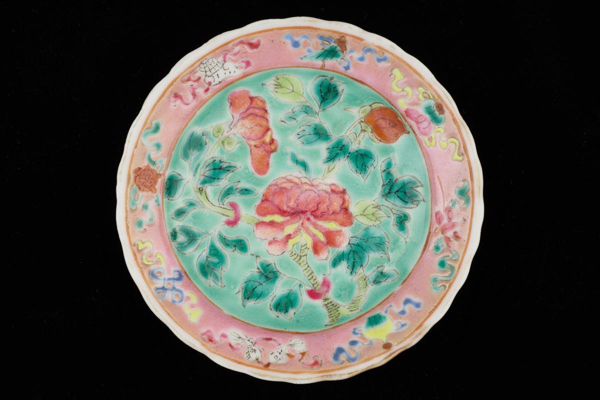 This dish features a floral motif with an everted and scalloped rim (filled with the eight Buddhist emblems), as well as gilded edges.