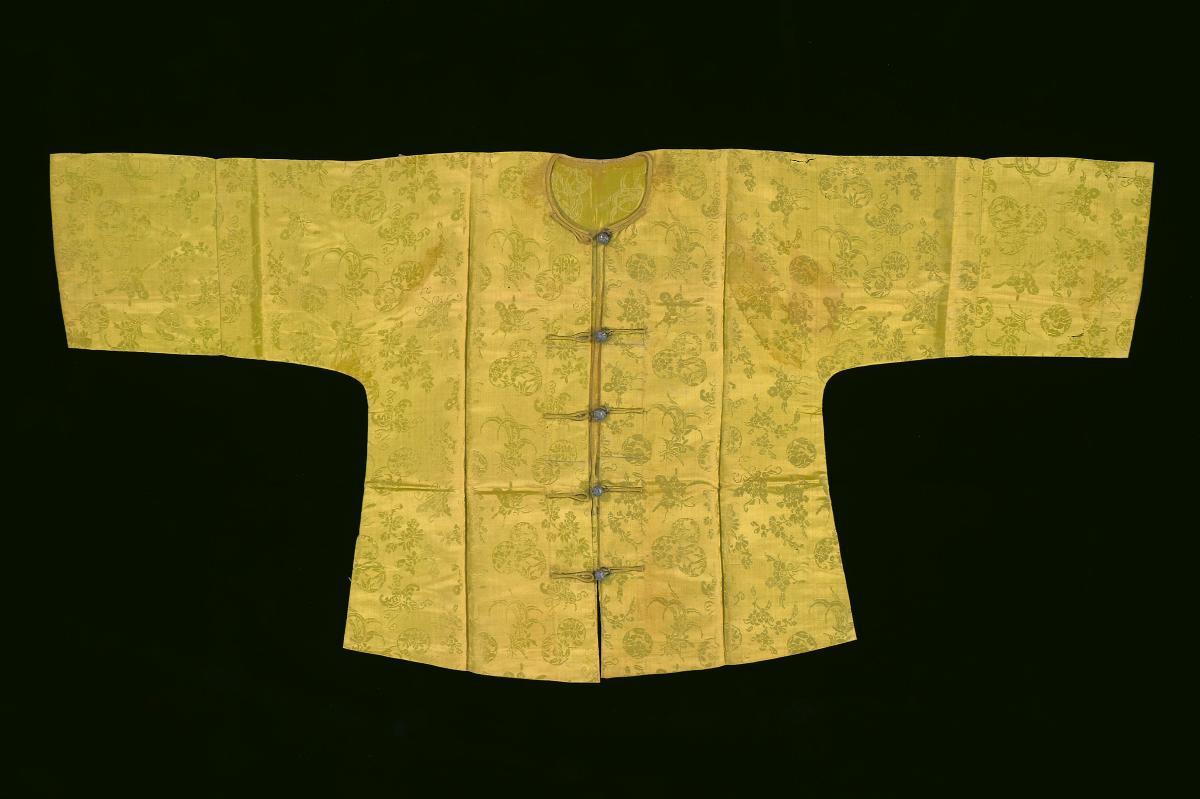This jacket with floral motifs belongs to the Dayak people of Borneo. A decorative panel at the back of the jacket features geometric motifs and human figures, while its border is embellished with an appliqué of buttons, which were obtained through trade. A fringe of tassel made from strips of cloth decorates the lower edge of the jacket.