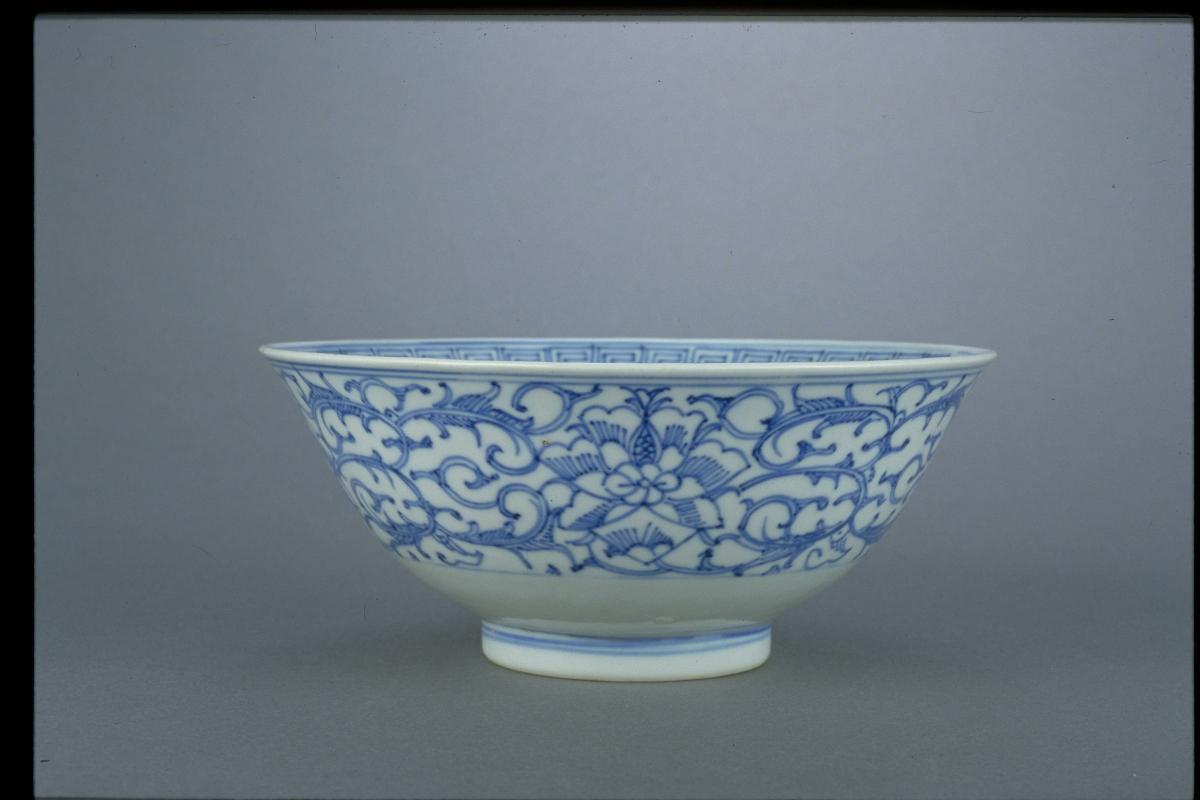 Chinese blue and white porcelain ware was widely used in Southeast Asia. It was cheaper and more durable than polychrome enamel ware. It was used by the Peranakan Chinese mainly for ancestral offerings and for making offerings during funeral ceremonies, as blue (a substitute for black) and white were their traditional colours of mourning. However, such wares were common and thus not exclusive to the Straits Chinese household. These bowls feature a foliage motif.