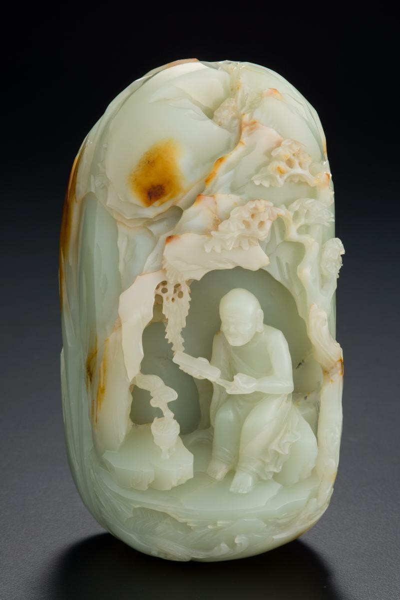 This miniature mountain was carved from a piece of white jade that had naturally occurred in the shape of a triangle. The natural shape of the stone formed the mountain itself, while bold sculpting on the sides created the ridges. This ingenious design successfully preserved the primitive beauty of the jade, and reflects the sophisticated aesthetic sense of the Chinese literati. The 17th and18th centuries witnessed the peak of the use of jade in folk art, curios and functional objects. In the Jiangnan region, the nerve centre of the Chinese literati, tastefully designed and finely carved jade objects were produced.