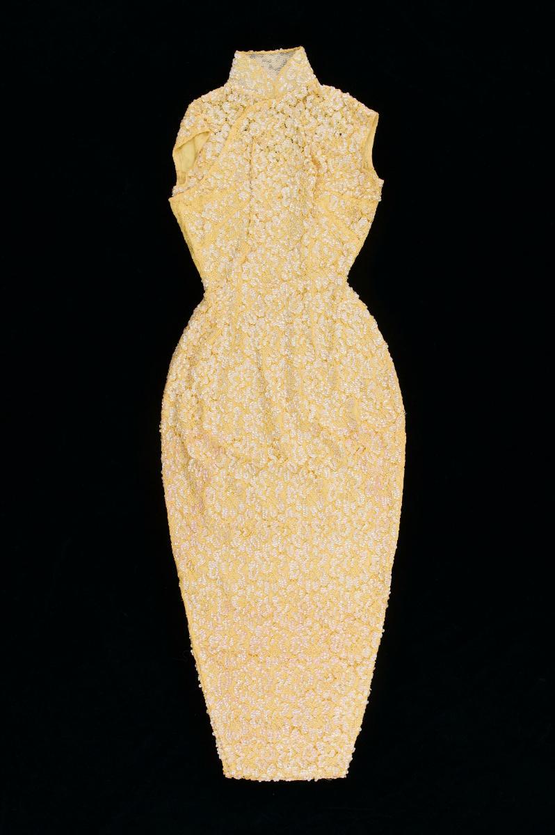 This is a yellow lace sleeveless cheongsam decorated with floral embroidery all over. This piece has a nipped-in waist popular in the 1950s and 1960s. The flap on the right-hand side is secured by press studs while the zipper is at the side. This cheongsam belonged to Mdm. Wu Chuen Chuen, who enjoyed wearing it to work and parties, often with a corset underneath to achieve the desired hourglass figure. A leading businesswoman of her time, Mdm. Wu ran the former Stamford Café at Bras Basah Road for 30 years before it closed in the 1970s.