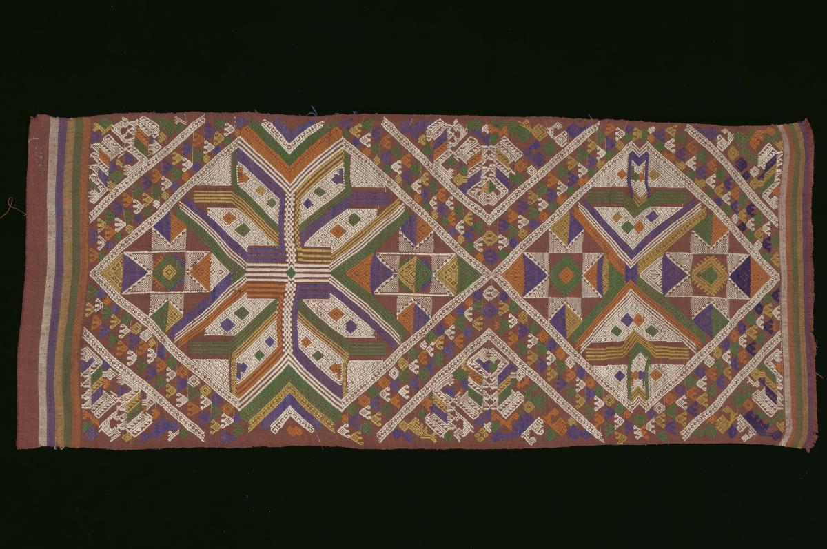 This door hanging is embroidered in couched gilt threads against a multi-coloured silk ground. There are also calligraphic inscriptions done in thulth script. These richly embroidered hangings may have been used on the interior doorways of grand homes to create the impression of a mihrab (the prayer niche in mosques). These textiles echo in cloth what was found on architectural facades in stucco. The inscriptions usually consist of Qur’anic verses, prayers and benedictions.The love of geometry in Islamic art is evident in the inscriptions on this doorway hanging. The inscriptions are repeated on each side, with the uppermost central panel embroidered in mirrored script. Mirror-writing, a popular art form in Ottoman art, demonstrates the level of ingenuity, experimention and refinement of calligraphic compositions during this era.