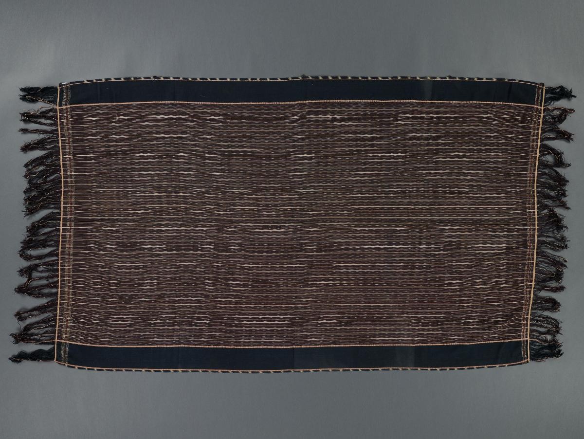A ‘selendang’ or shoulder cloth is a narrow piece of rectangular cloth worn over the shoulder. It has been suggested that the abstract floral designs that surround the cross-shaped motifs and the lozenges represent the stylised double-wing symbol of the garuda, the mount of Vishnu in Hindu mythology. The centrefield was made using songket supplementary weft weave. It features rows of elongated triangles known in Malay as ‘pucuk rebung’ or ‘bamboo shoots’. Such ornamentation was popularised by its usage on Indian trade cloths.