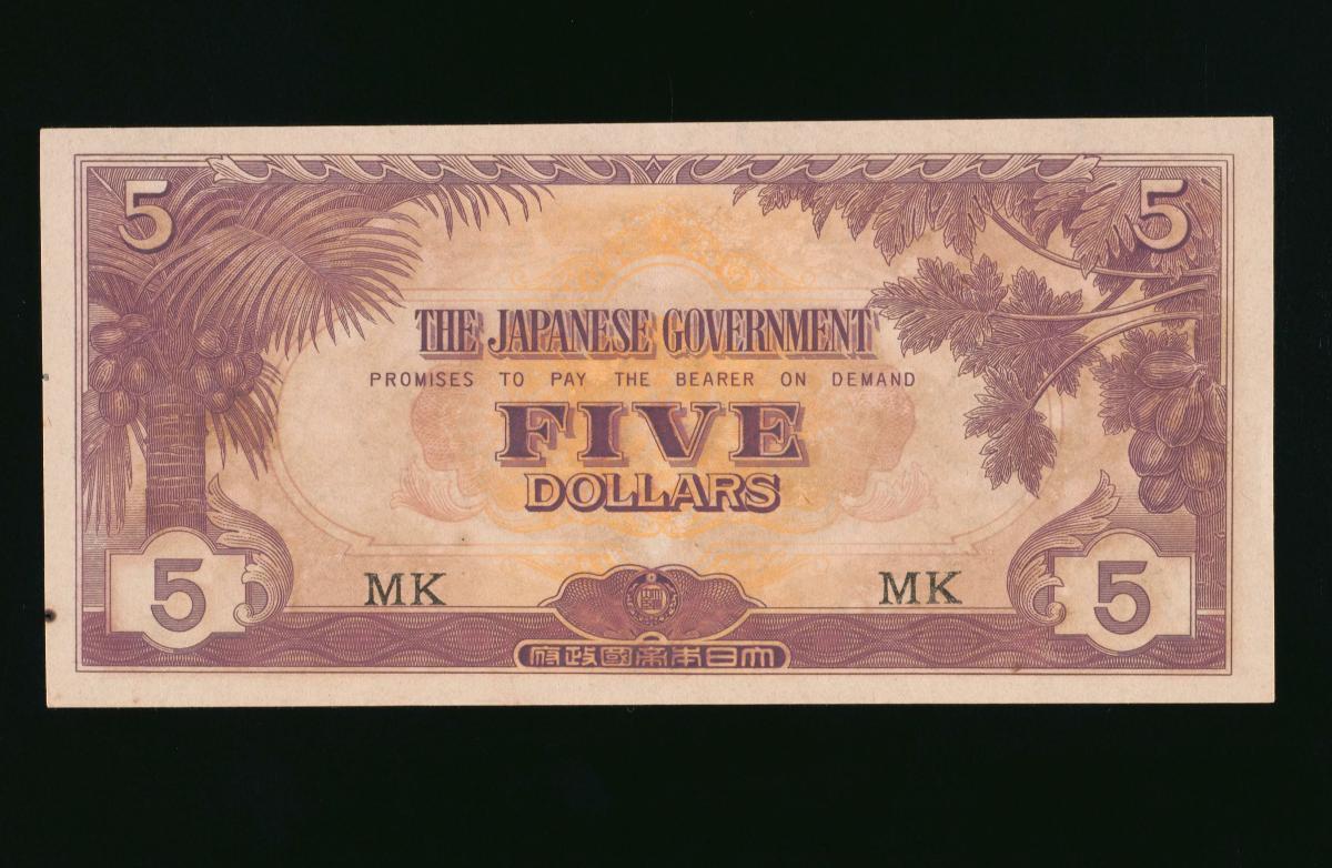 Japanese invasion money (JIM) was paper money used by the Japanese to establish economic control in occupied areas during World War Two. Blocks or code letters (e.g. MA or M/AH) were printed on the paper money for circulation control. The first letter of the code indicates where the money was used. In this case, paper money with blocks starting with the letter ‘M’ was used in Malaya (and Singapore). JIM issued in Malaya was known as ‘banana money’, a term originated from the motif of the banana tree on the obverse of the ten dollar notes. This five dollar note features a coconut tree (left) and papaya tree (right) on the obverse.