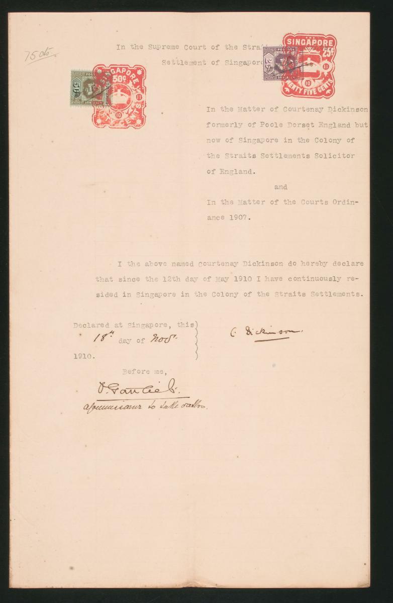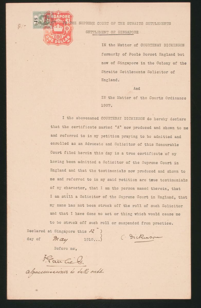 This is an oath sworn by Courtenay Dickinson on 21 November 1910. It is part of a collection of legal documents from the 19th and early 20th centuries which provides a glimpse into the work of the notable personalities who left their mark on Singapore’s legal history, and the economic and other transactions undertaken by ordinary immigrants in 19th century Singapore that tell stories of misfortune and indebtedness which would otherwise have disappeared from history.