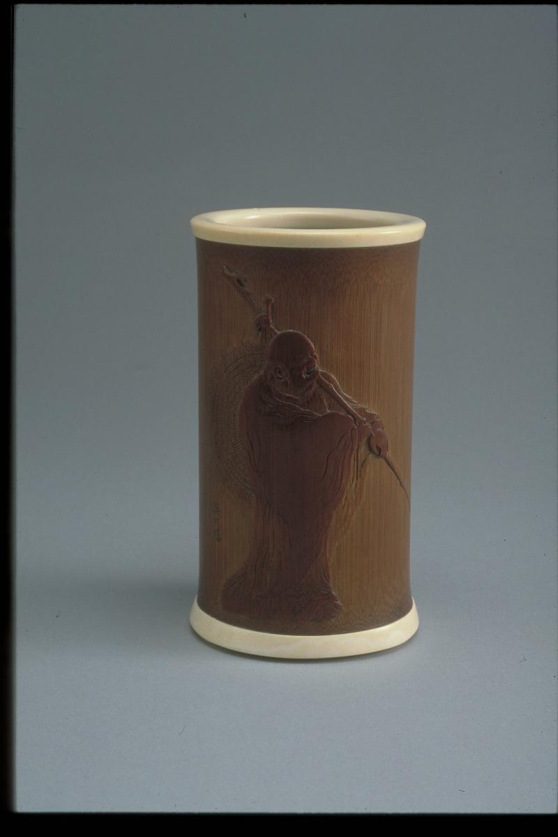 This ivory relief carving depicts a scene of the passion of Jesus Christ. It shows a figure standing with his bible before two women with haloes below an arched-shaped wall.