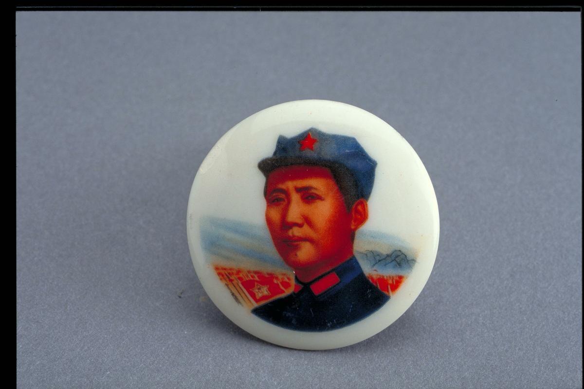 This badge features one of the most iconic Mao images ever produced. It shows a youthful and resolute Mao. His posture and clenched fists are symbolic of his will-power to carry forth the communist revolution. This image was based on a 1967 oil painting by a young artist named Liu Chunhua. 900 million copies of this painting were supposed to have been printed and distributed during the Cultural Revolution. It has been described by Mao’s wife, Jiang Qing, as a “model painting” and served as a standard for later pictorial representations of Mao. Huge numbers of badges were produced at the height of the Cultural Revolution, from 1966 to 1969.