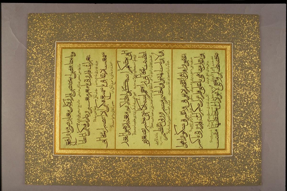 A practice sheet such as this piece basically functions as a place for calligraphers to test the pen, the consistency of the ink, the style and the sizes of the scripts. It was also usual for the calligrapher to use all the available space on a sheet of paper, thus earning it the term ‘karalama’ in Turkish, which literally means ‘blackening’. This piece contains two cursive scripts, thulth and naskh. The signature written in Tawqi, which is another cursive script reads: "Copied by the one needy (for God's favour) Omer Katib Scribe of the Royal Palace.”Calligraphy has always been considered the noblest and most featured art in the world of Islam as it transmits the Divine Revelations of God. The pious desire to beautify the Word of God was a central factor in the development of calligraphy in the Islamic world. In the different regions of the Islamic world, different scripts evolved.