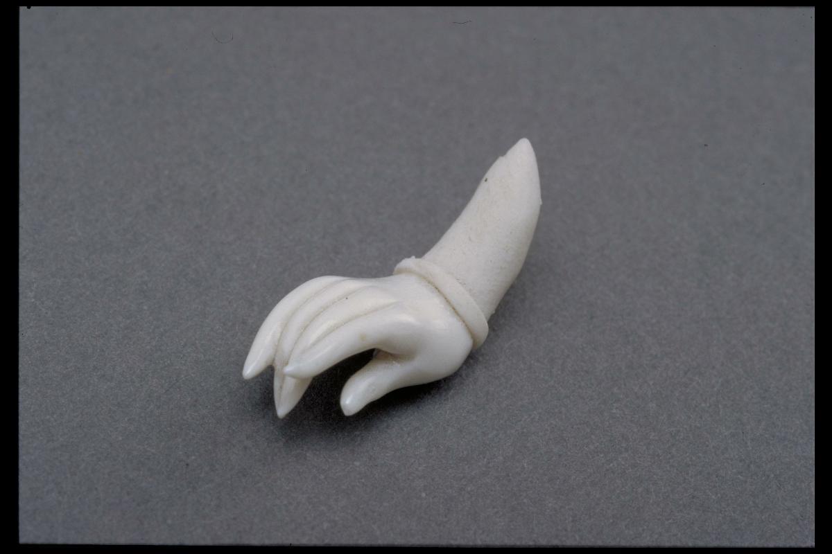 This piece covered in pure white glaze was made to be inserted into the arms of religious figures possibly as a replacement for those that broke. Modelled by hand, this example is crude in the details.Dehua, a district in Fujian province, is the production centre for white porcelain, which is known to the Chinese as 'zhuyoubai' (pork-grease white) or 'xiangyabai' (ivory white), and to the Europeans, 'blanc de Chine' (white porcelain). As these names suggest, Dehua porcelain has a white body, consisting predominantly of porcelain stone ('baidunzi') with minute amounts of clay. This porcelain was produced as early as the 14th century. However, production and quality peaked in the 17th century. A variety of techniques, including press-moulding and slip-casting, were used to create a wide repertory of wares. This ranged from religious figurines to scholar’s objects and enamelled wares.