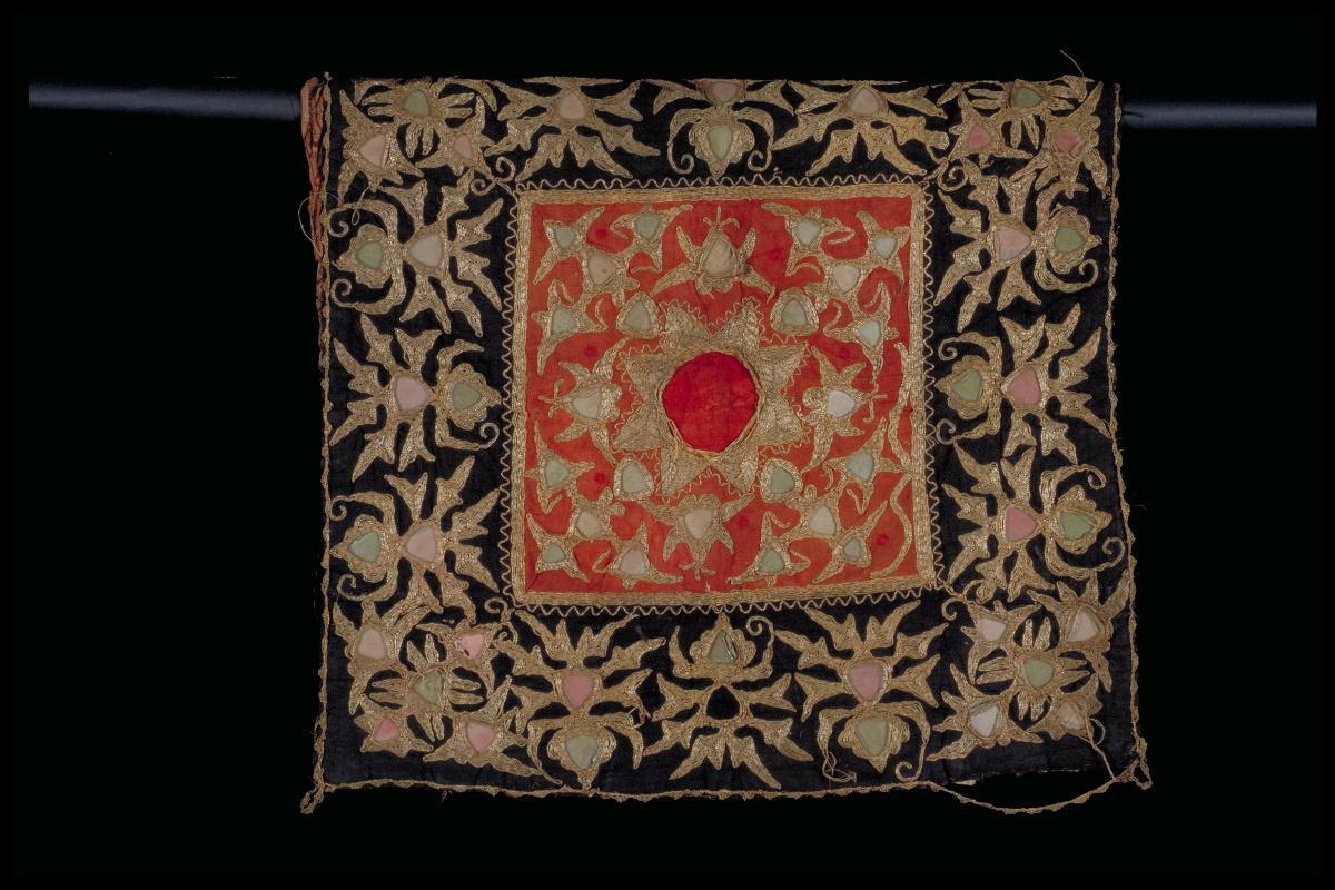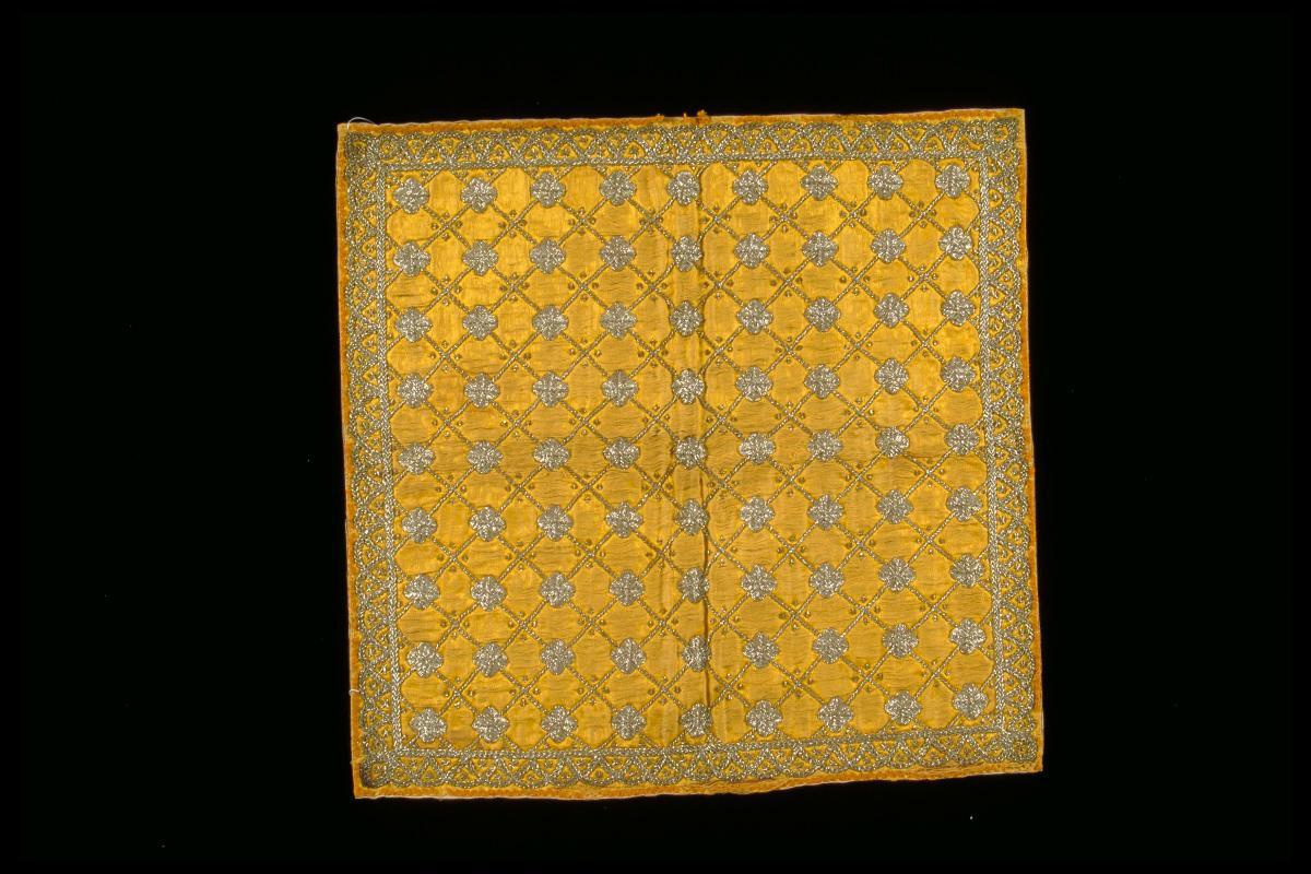 This textile is a songket cloth woven using gold wrapped thread in a supplementary weft against a maroon ground. The centrefield of this textile is scattered with an eight-petalled floral motif known in some Malay communities as the ‘bunga cengkih’ or ‘clove flower’. Such cloths were used to line trays of ceremonial gifts, usually in weddings or for rituals.