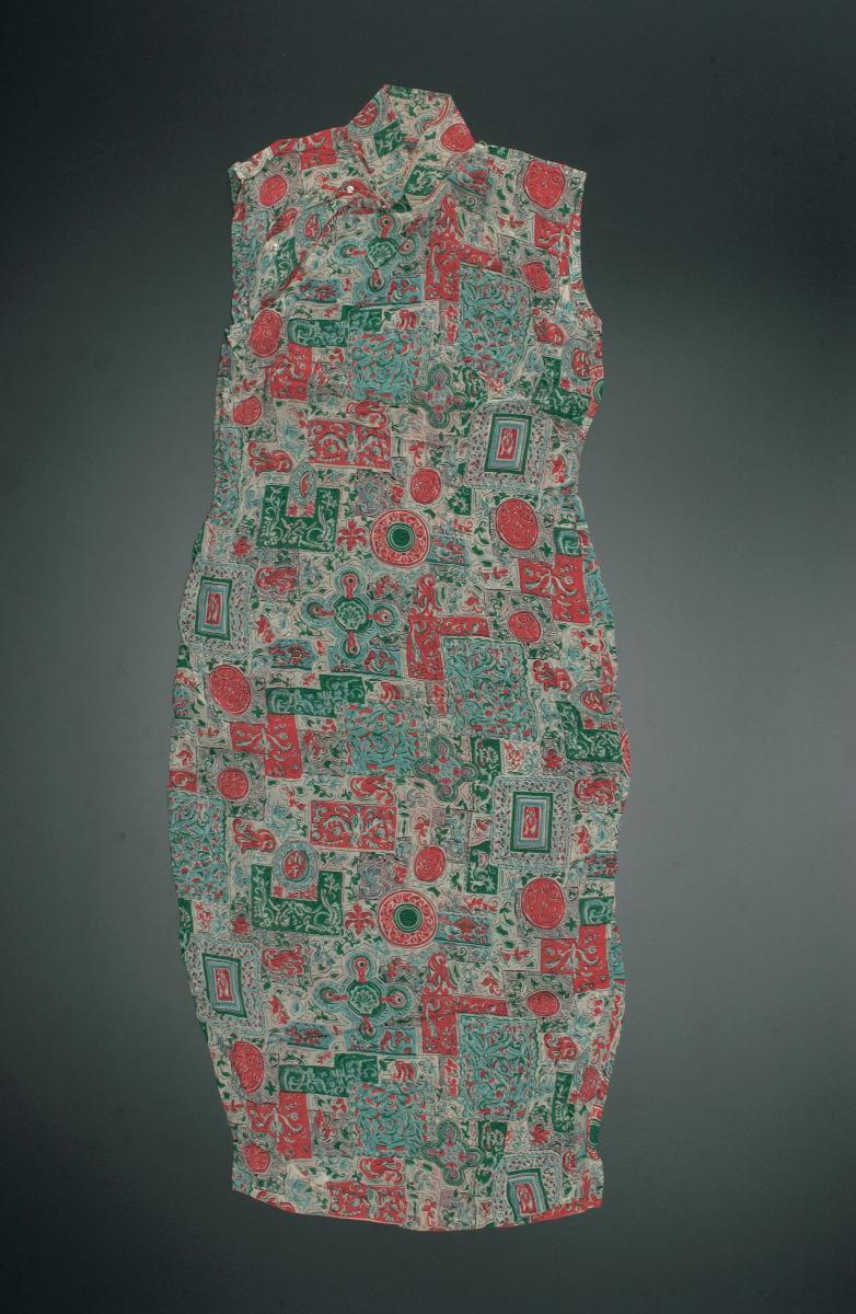 This is a cheongsam decorated with green and purple medallions and geometric patterns all over. The flap on the right is secured by press studs.This cheongsam belonged to Mdm. Wu Chuen Chuen, who enjoyed wearing it to parties, often with a corset underneath to achieve the desired hourglass figure. A leading businesswoman of her time, Mdm. Wu ran the former Stamford Café at Bras Basah Road for 30 years before it closed in the 1970s.