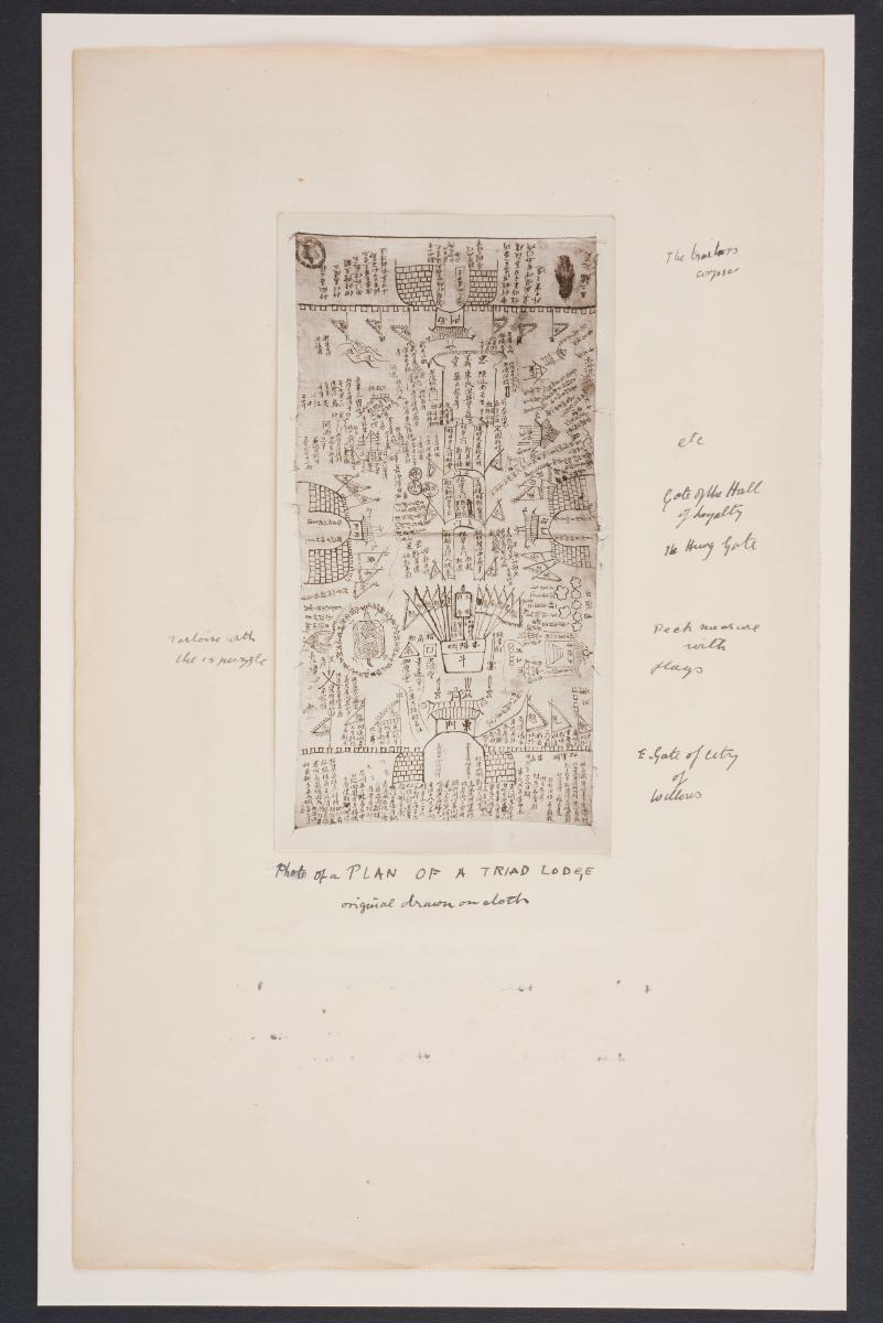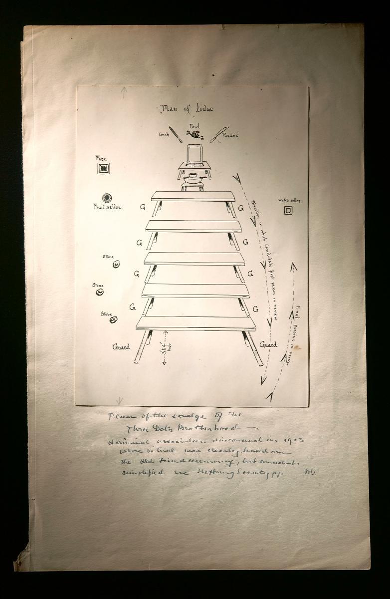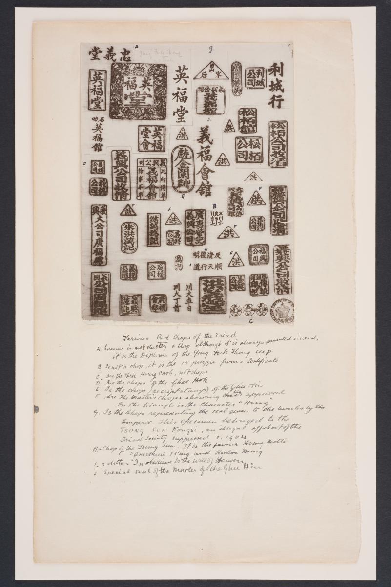 These notes about the initiation ceremony of the Tiandihui (Heaven and Earth Society) were made by William Stirling, Assistant Protector of Chinese in Singapore from 1921 to 1931. He complied six pages of notes about the ceremony. The Tiandihui was a local version of the secret society in China, a sworn fraternity comprising men with the common aim of overthrowing the Qing dynasty and restoring the Ming. With increased migration to Singapore in the 19th century, it developed into a form of mutual aid and support for the Chinese migrants. The initiation ceremony of the Tiandihui was an elaborate and dramatic affair that saw the induction of new members into the secret society. It included a series of rituals which culminated in the swearing of a blood oath when new initiates swore lifelong allegiance to the society.